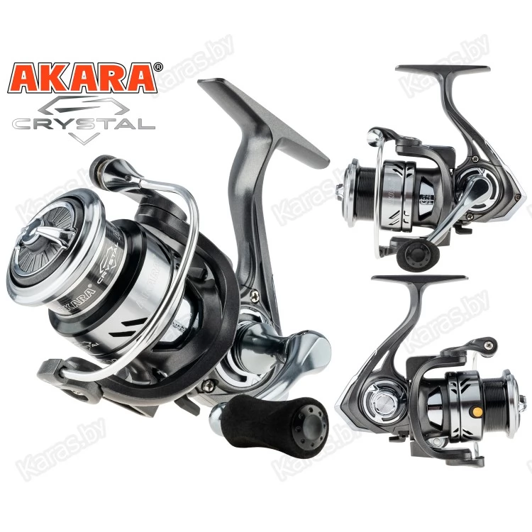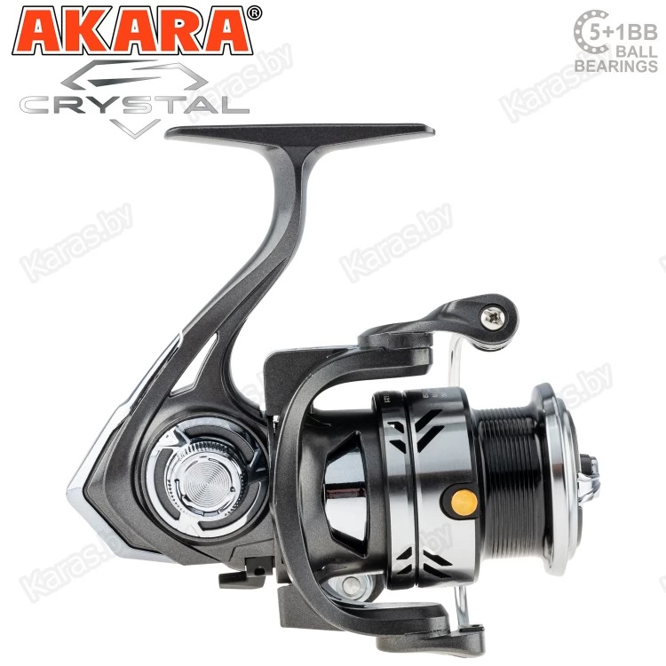 Новинка 2024 года - серия доступных спиннинговых катушек Akara Crystal. Особенностью данной катушки является ручка, вкручивающаяся прямо в главную пару. Катушка разработана с использованием современных технологий. Корпус катушки выполнен из ударопрочного композитного полимера, под которым расположены 5+1 шарикоподшипников и червячный вал, выполненный из бронзы. Катушка оснащена передним, многодисковым, сверхточным фрикционом, усиленной дужкой лескоукладывателя, магнитным тормозом и металлической шпулей.