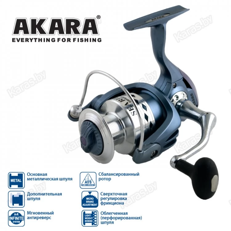 Akara Sea Rider - катушка предназначена для дальнего заброса и силовой ловли. Глубокая шпуля с увеличенной лесоемкостью позволяет намотать леску или шнур с необходимым запасом. Механизмом с увеличенными шестерёнками главной передачи. Усиленная ручка из алюминия оснащена эргономичным обрезиненным держателем. Посадочное гнездо ручки на корпусе усиленно алюминиевой вставкой, что делает этот узел надёжнее и долговечнее. Перфорированный ротор и корпус катушки. Алюминиевая ручка-сустав. Мгновенный фрикцион. Усиленная полая дуга. Силовой агрегат выполнен из пары твердосплавный алюминий-бронза. Двухконусный лесоукладыватель предназначен для всех типов лесок и шнуров. Максимальная нагрузка на фрикцион: SRF4000 – 9кг, SRF5000 – 10кг, SRF6000 – 12кг.