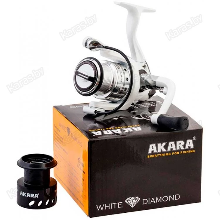 Akara White Diamond - среднескоростная безынерционная катушка среднего ценового сегмента. Akara White Diamond выпускается в трех размерах: 1000, 2000, 3000. Размер 3000 подойдёт для начинающих спиннингистов. Основная шпуля из алюминиевого сплава с перфорацией. Специальный профиль бортика шпули позволяет совершать дальние и точные забросы , предотвращает образование петель. Катушка прекрасно проявляет себя в работе со шнурами. В комплекте поставляется дополнительная шпуля из графита аналогичной емкости. Полая дужка лесоукладывателя предотвращает закручивание лески. Корпус катушки выполнен из современного композита, что делает ее достаточно легкой в своем классе при сохранении прочности.