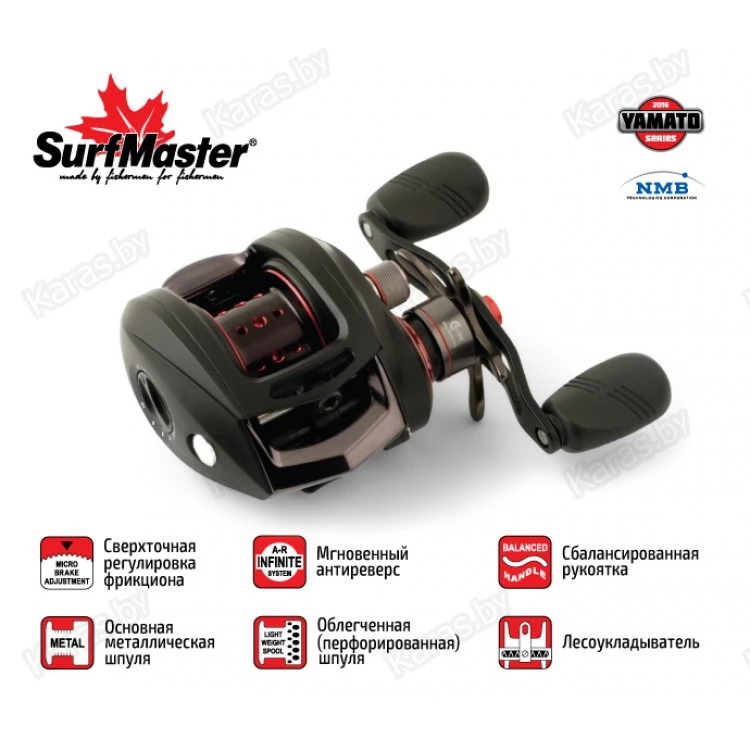Surf Master Yamato Sensei Cast SC – флагман кастинговых мультипликаторов от Surf Master. Собран на металлической раме и оснащен линейным магнитным тормозом. Твердосплавное покрытие основной шестерни делает его работу долговечной. Плавность хода шпули и увеличенная дальность заброса была достигнута за счет установки NMB подшипников National Precision Bearing Group (USA). Вес шпули 21,4г, диаметр 25мм.