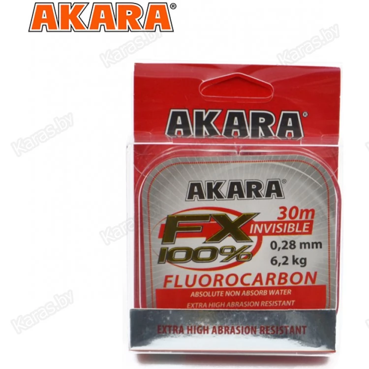 Флюорокарбон Akara FX 100% – разновидность рыболовной лески полностью изготовленной из материала поливинилиденфторид, он же PVDF (polyvinylidene fluoride), химический фторсодержащий полимер. Сегодня флюорокарбон широкого используется рыболовами для изготовления поводков или вместо обычной монофильной лески. Данный материал имеет комплекс уникальных свойств и характеристик, благодаря которым снасти изготовленные из этого материала существенно превосходят их традиционные аналоги. В первую очередь флюорокарбон полюбился рыболовам за высокие физико-механические характеристики, такие как высокая абразивостойкость, низкая растяжимость, в отличии от обычной лески флюорокарбон не впитывает воду (степень впитываемости менее 1%). Немаловажное значение имеет то, что флюорокарбон невидим в воде, благодаря этому у рыболова появляется возможность поймать любую, даже самую осторожную рыбу. Большой популярностью пользуется флюорокарбон у любителей зимней рыбалки, так как эта леска не перетирается о лед, не обмерзает, и прекрасно тонет (флюорокарбон тонущий материал), благодаря чему улучшается качество игры и контроль приманок. Благодаря низкой степени растяжимости он хорошо передает поклевку, делает подсечку более быстрой и эффективной.