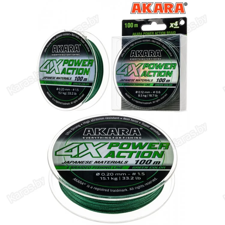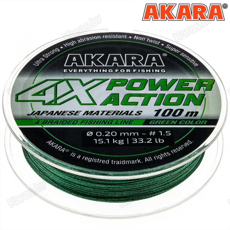 Akara Power Action X-4 - универсальный плетёный четырехжильный рыболовный шнур, выпускаемый под торговой маркой Akara. Шнур создан для того, чтобы удовлетворить потребности рыболовов в качественном, надежном, прочном и недорогом шнуре. Шнур зеленого цвета. Изготовлен из плотного волокна японского производства. Шнур отличается высокой прочностью и надежностью, имеет круглую форму, абразивоустойчив и подойдет практически для любых условий лова, в том числе для ловли в местах, где высока вероятность зацепов