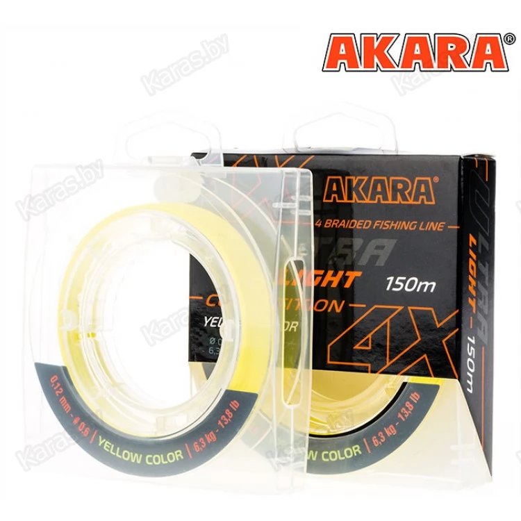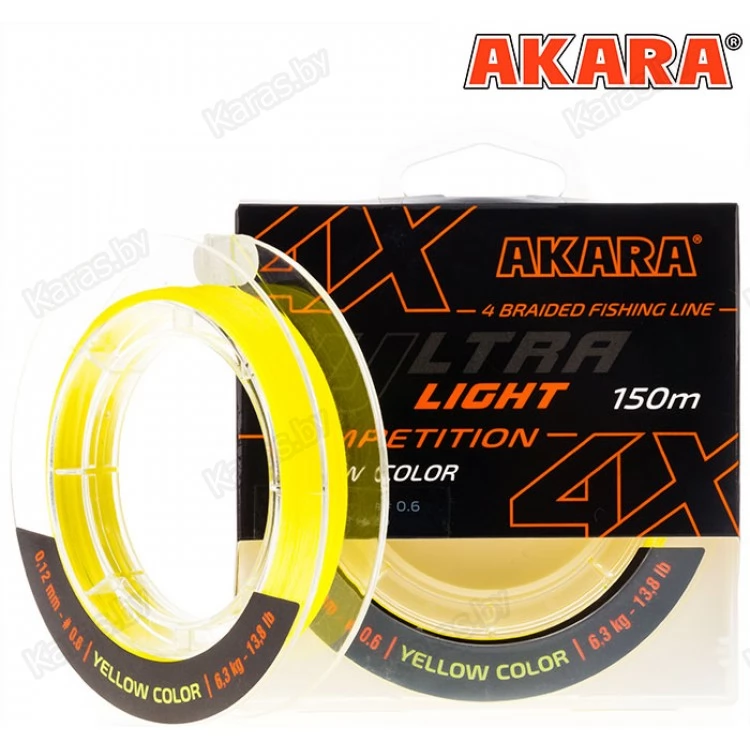 Akara Ultra Light Competition X-4 150м - универсальный плетёный четырехжильный рыболовный шнур, выпускаемый под торговой маркой Akara. Шнур создан для того чтобы удовлетворить потребности рыболовов в качественном, надежном, прочном и недорогом шнуре. Эффективен для ловли на мелкие приманки. Сплетен из нового современного волокна японского производства повышенной плотности. Отличается высокой прочностью и надежностью и подойдет практически для любых условий лова, в том числе для ловли в местах, где высока вероятность зацепов. Ultra Light X-4 имеет круглую форму.