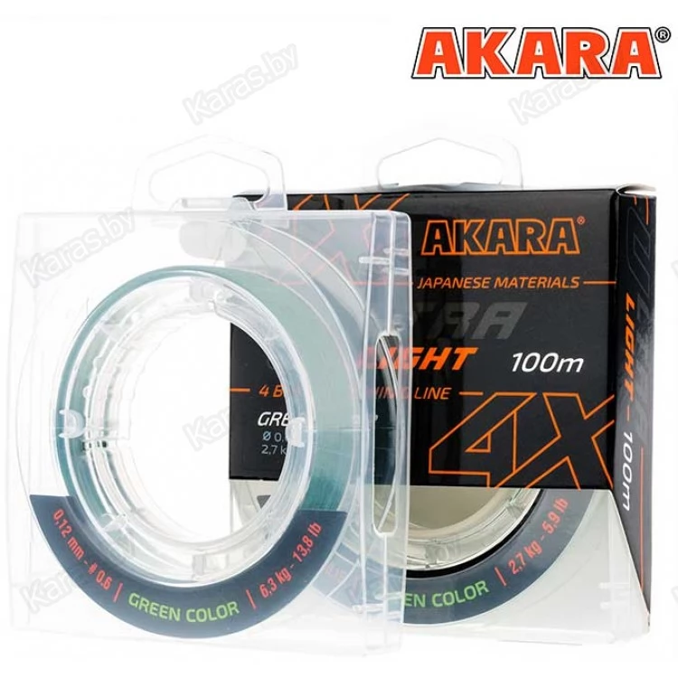 Akara Ultra Light X-4 100м - универсальный плетёный четырехжильный рыболовный шнур, выпускаемый под торговой маркой Akara. Шнур создан для того чтобы удовлетворить потребности рыболовов в качественном, надежном, прочном и недорогом шнуре. Эффективен для ловли на мелкие приманки. Сплетен из нового современного волокна японского производства повышенной плотности. Отличается высокой прочностью и надежностью и подойдет практически для любых условий лова, в том числе для ловли в местах, где высока вероятность зацепов. Ultra Light X-4 имеет круглую форму.
