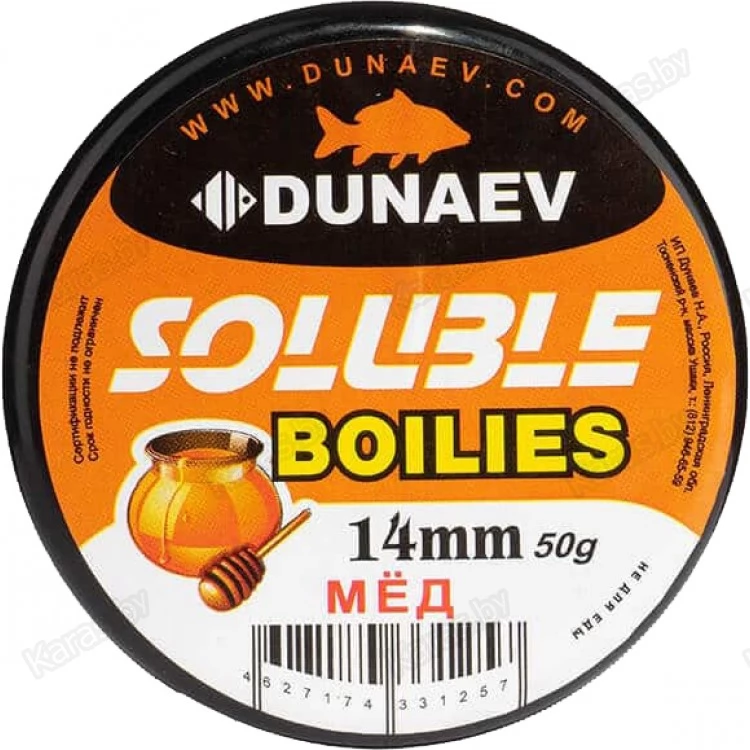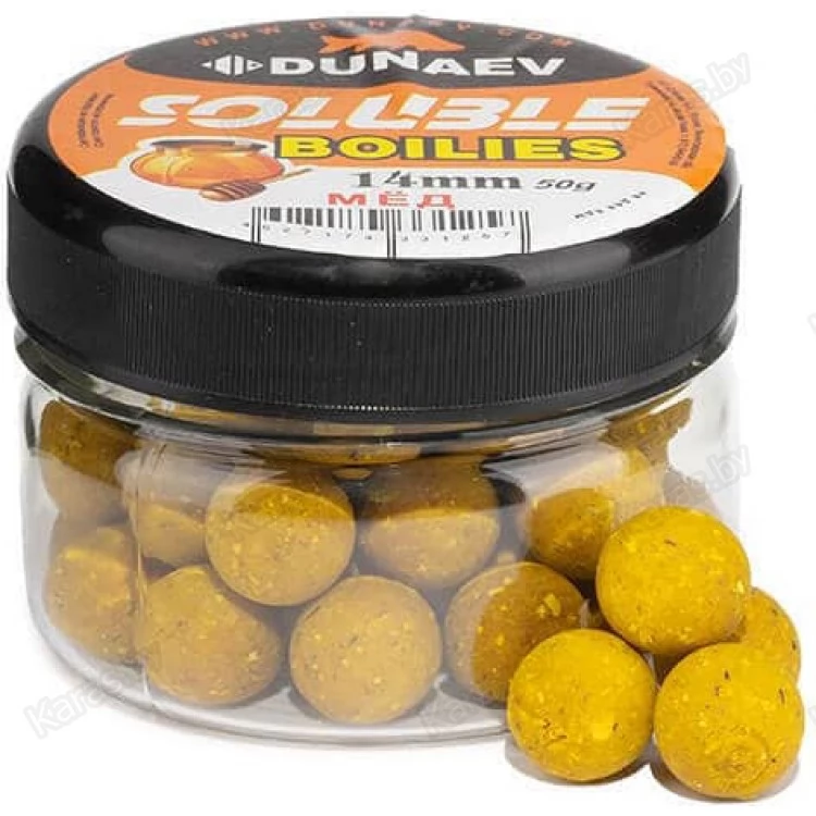 Бойлы пылящие Dunaev диаметром 14 мм. Тонущие. Рекомендованы как прикормочные. Под водой постепенно распадаются на множество ароматных и вкусных частиц, формируя облачко. Рецептура продумана так, чтобы стимулировать аппетит рыбы, но не дать ей ощутить насыщение. В результате потенциальная добыча дольше остается в зоне лова. Включает классические для карпфишинга и ловли другой мирной рыбы ароматы: фруктовые, ягодные, рыбные, а также коноплю, мед, шоколад и т.д. Дразнящий выраженный запах хорошо распространяется по акватории и поможет пробудить аппетит даже у сытых, малоактивных особей.