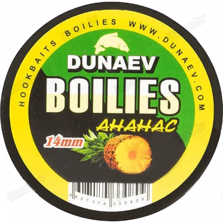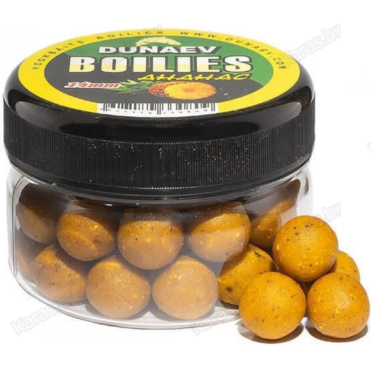 Бойлы Dunaev Вареные имеют диаметр 14 мм и рекомендованы в качестве самостоятельной насадки и в комбинации с другими бойлами. Эластичность структуры упрощает монтаж и подрезку. Обладают отрицательной плавучестью. Потому их рационально использовать там, где мало растительности и твёрдое дно. Рецептура включает вещества, которые не дают рыбе почувствовать насыщения, удерживая в нужной точке. Аромат быстро распространяется по акватории, пробуждая аппетит даже у вялых особей.