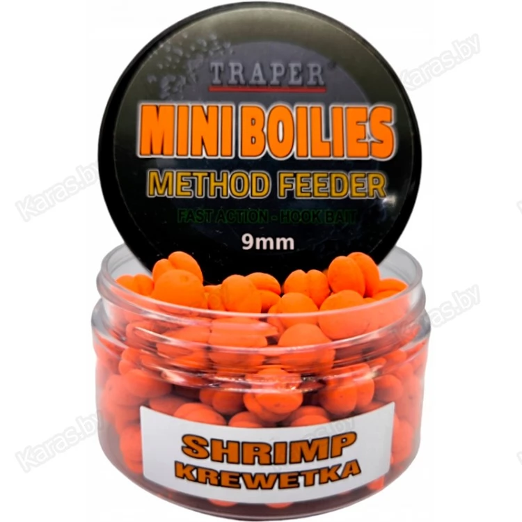 Мини-бойлы Traper Mini Boilies Method Feeder – приманки, которые могут применяться для ловли карпа на фидер или ловли другой крупной рыбы с применением фидера и кормушками флэт и метод. Основная задача этих мини-бойлов отсекать мелкую рыбу, исключая возможность ее поклевки и попадания на крючок. Бойлы имеют такой размер – 9 мм, который исключает возможность поднятия этой приманки некрупной рыбой. За счет размера бойлов происходит селективный отбор рыбы по размеру. Мелкая рыба ничего не может сделать этим приманкам, ни объесть их, ни проглотить. Мини-бойлы сделаны по тем же принципам, что и бойлы классического размера. Они могут вполне заинтересовать карпа, трофейного леща, крупного карася, крупного линя, голавля или крупную плотву. Наибольшую свою эффективность приманки этой версии показывают на различных коммерческих водоемах, где главными объектами ловли на фидер являются небольшие и среднего размера карпы, а также караси. Приманки Traper Mini Boilies Method Feeder в фидерной ловле используются в комбинации с методными кормушками. Из-за своего небольшого размера, в сравнении с обычными бойлами, мини-бойлы занимают не такой большой объем в пресс-форме для кормушек. Поэтому количество прикормки в кормушке не уменьшается незначительно. Traper Mini Boilies Method Feeder – это приманки с высоким содержанием протеина и активных аттрактантов.