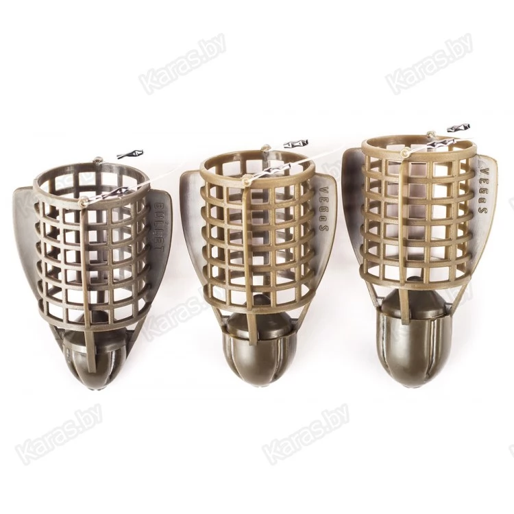 Пластиковые фидерные кормушки в виде сетки с грузом в форме пули. Кормушки обладают отличными полётными характеристиками.