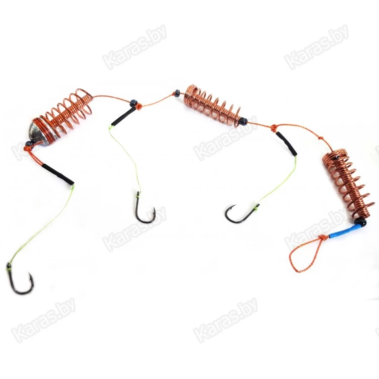 Монтаж оснащён тремя витыми кормушками и тремя крючками на плетёных поводках.