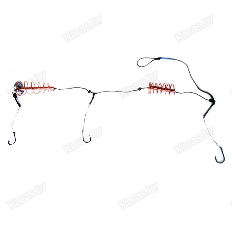 Монтаж оснащён двумя витыми кормушками и тремя крючками на плетёных поводках.