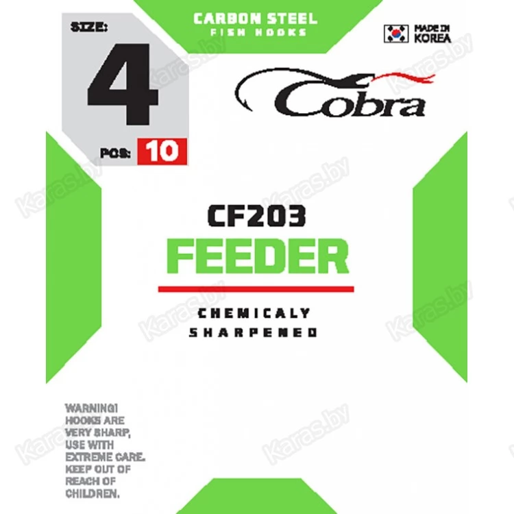 Бренд Cobra представляет серию фидерных крючков, специально разработанных ведущими мировыми спортсменами, для активной ловли рыбы на фидер. Кручки выполнены из высокоуглеродистой стали (Taff Wire), что делает их прочными и устойчивыми к нагрузкам. Крючки держат форму и не деформируются, даже при серьезных нагрузках, зацепах и на вываживании крупной рыбы. Новейшие технологии термообработки и электромеханическая заточка жала крючка позволяет использовать все виды насадок, даже самые капризные, коими являются мотыль и опарыш. На производстве используется лазерный контроль качества заточки, что обеспечивает однородность всей выпускаемой продукции. Стойкое антикоррозийное покрытие.