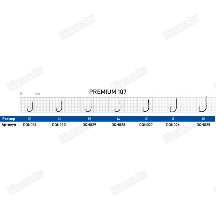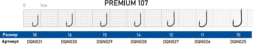 Premium 107-109 – эти рыболовные крючки получили популярность из-за формы со сложным изгибом и тонкой проволоки. Подойдут для фидерной и поплавочной ловли. Крючки практически не разгибаются, а жало очень остро заточено. Будьте аккуратны при вываживании и не торопитесь достать рыбу. Крючки этой серии - однотипные, различаются только цветом: черный №107, бронзовый №109.