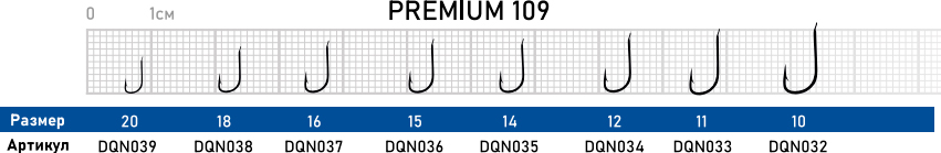 Premium 107-109 – эти рыболовные крючки получили популярность из-за формы со сложным изгибом и тонкой проволоки. Подойдут для фидерной и поплавочной ловли. Крючки практически не разгибаются, а жало очень остро заточено. Будьте аккуратны при вываживании и не торопитесь достать рыбу. Крючки этой серии - однотипные, различаются только цветом: черный №107, бронзовый №109.