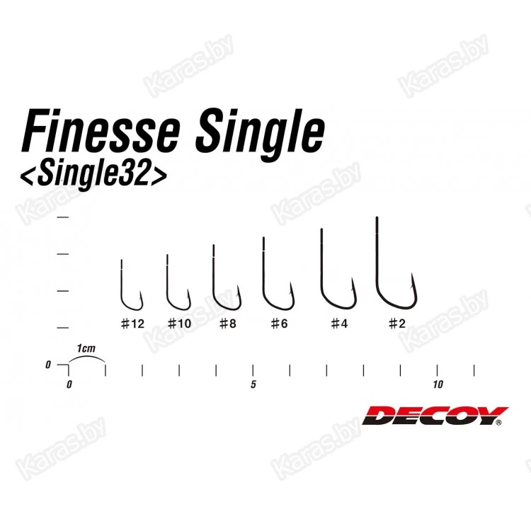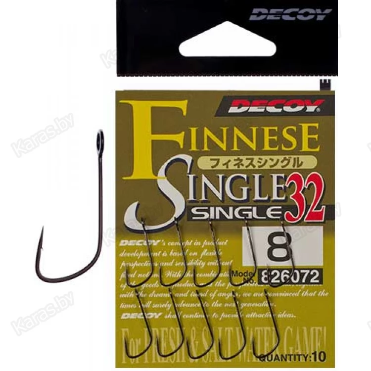 Крючок Decoy Single 32 предназначен для оснащения силиконовых приманок при ловле хищной рыбы. Что примечательно, форма крючка была разработана в сотрудничестве с отечественными рыболовами-спортсменами, которые считаются одними из лучших спиннингистов в мире. Правильно подобранная толщина проволоки и особый изгиб, позволяют приманке лучше удерживаться на крючке и рыбе значительно сложнее стащить её. Также, такая форма способна выдержать большие нагрузки и меньше подвержена разгибанию. Single 32 имеет увеличенное ушко для большей свободы при осуществлении проводки.