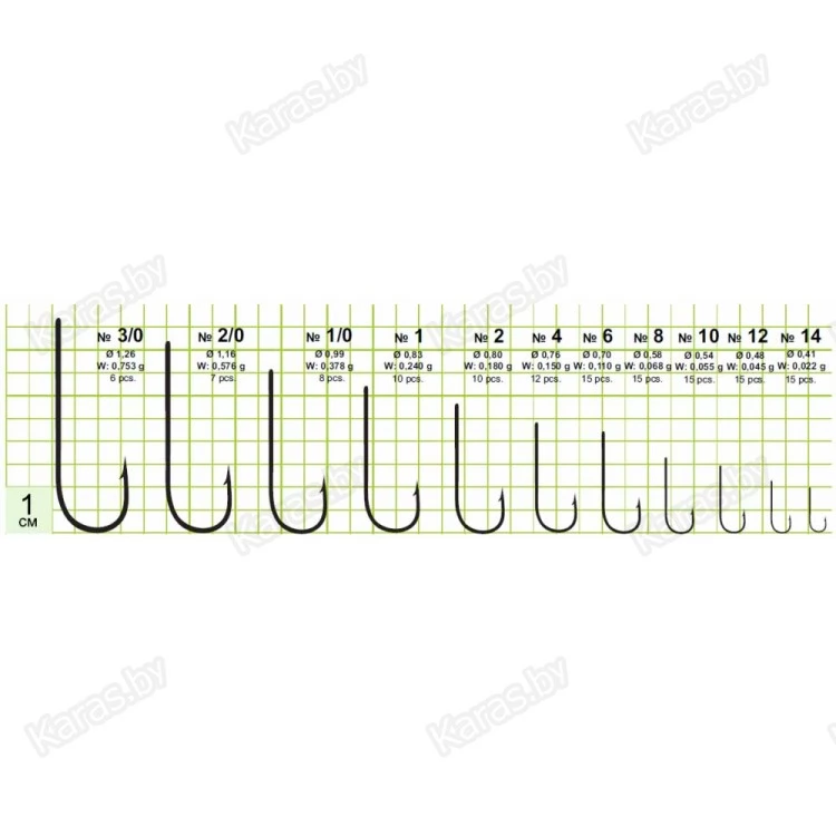 АртикулРазмерВес крючка, гДиаметр проволоки, ммКоличество в упаковке (шт.)