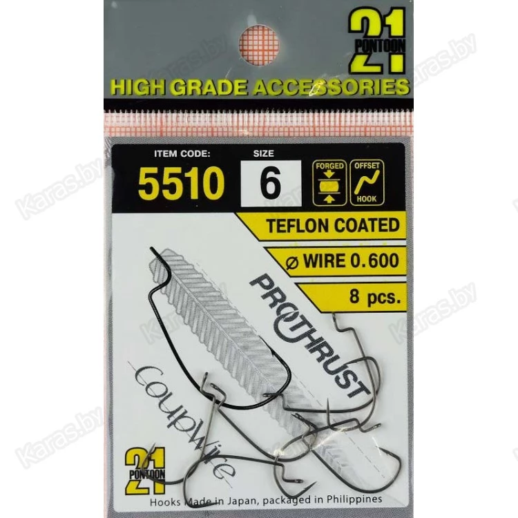 Крючки Pontoon 21 5510 ProtPoint Hooks изготовлены из мощной стальной проводоки высшего качества (CoupWire) и прошли процесс высокоточной закалки, благодаря которому отлично держат острейшую заточку (ProThrust). Эти крючки долго не тупятся и обладают необходимой упругостью, чтобы при сохранении прочности, не разгибаться и не ломаться на больших нагрузках.