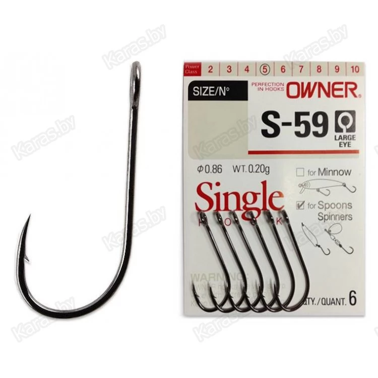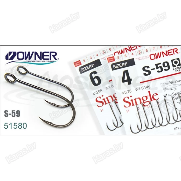 Серию крючков OWNER 51580 (S-59) рекомендуется использовать при оснащении блесен и различных типов воблеров, в том числе и минноу. Крючки характеризуются удлиненным цевьем, полукруглым загибом и удлиненным жалом. Данная серия крючков часто используются в дорогих японских воблерах и блеснах, легкого и ультра-легкого класса. Главное их отличие от обычных одинарных крючков – это большое широкое ушко для крепления к приманке через заводное кольцо.