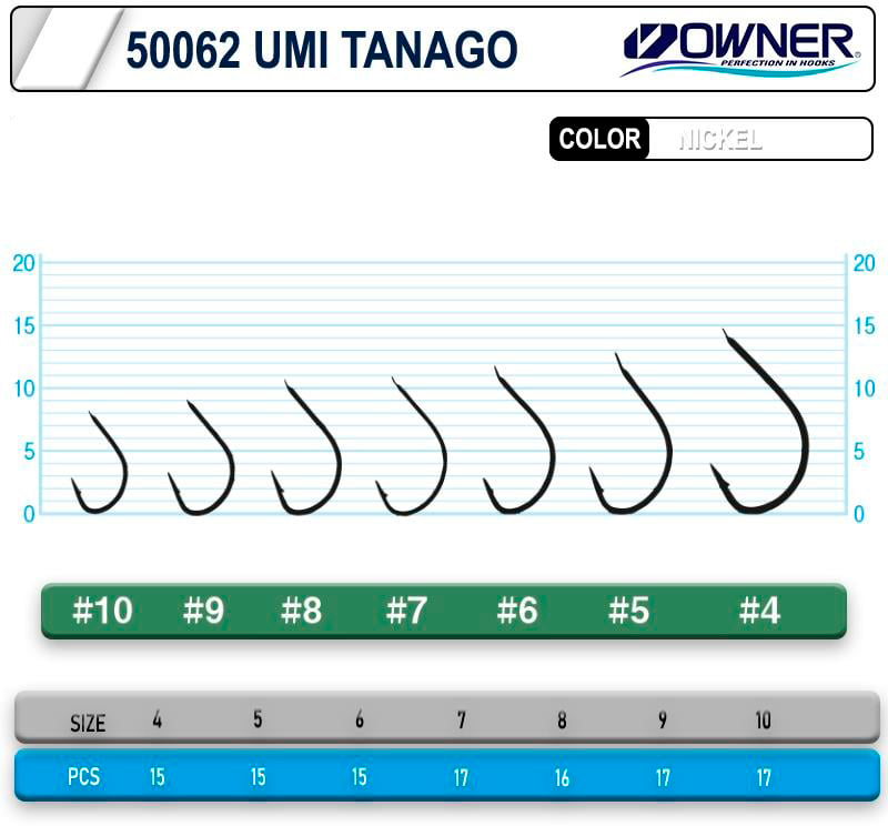 Универсальные зацепистые кованые «крутолобые» крючки с лопаткой. Размеры — от № 10 до № 4. Короткое цевье и широкий загиб. Жало с острейшей заточкой Super Needle Point. Покрытие — стойкое к коррозии «никель». 50062 Umi-Tanago хорошо подходят для ловли на растительные насадки: горох, кукурузу, зерна злаков, макароны, тесто и хлебный мякиш. Из животных — на пучок опарыша и крупных личинок насекомых, бутерброд. Лучше всего подходят для ловли карповых рыб поплавочной удочкой, когда жало крючка остается открытым — форма рассчитана на быструю подсечку, в том числе при ловле на большой дистанции.