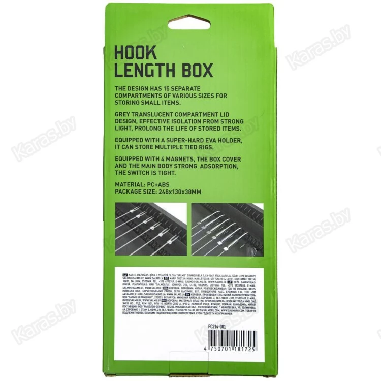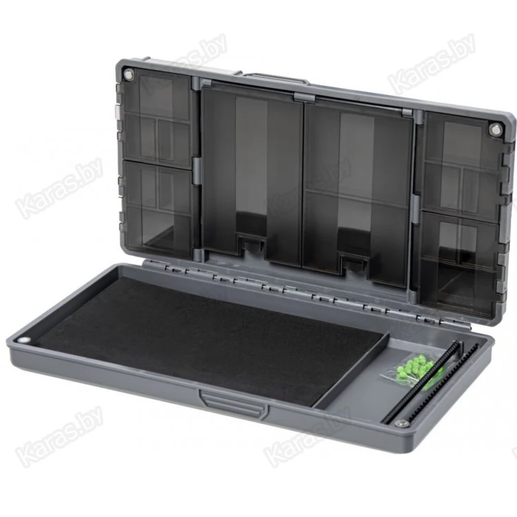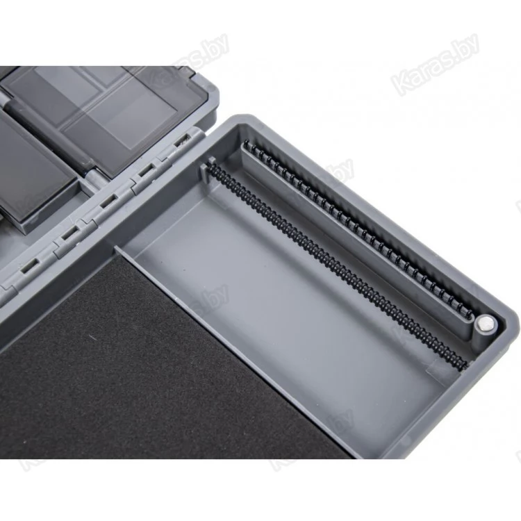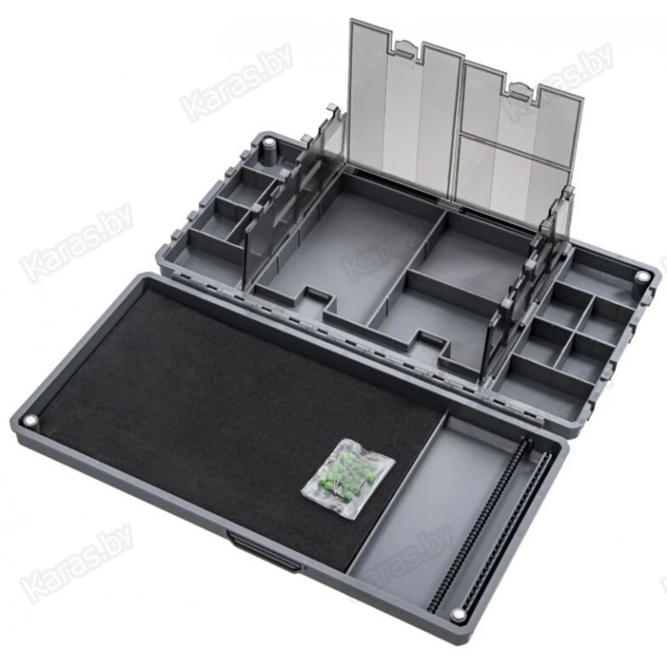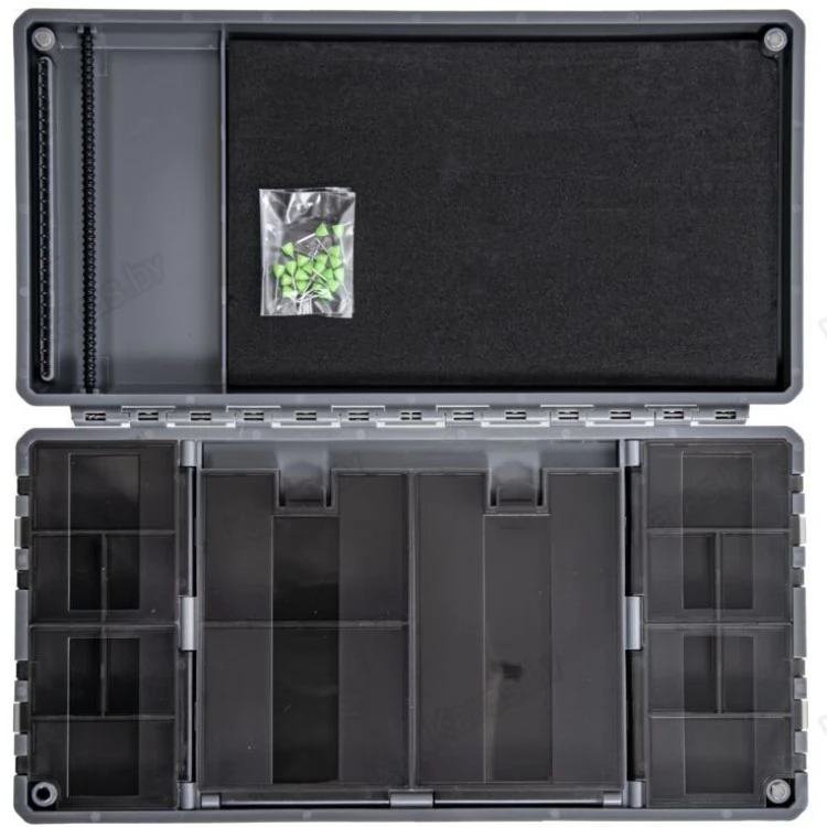 Поводочница для хранения и транспортировки готовых карповых поводков и комплектующих для их изготовления. На одной стороне коробки располагается подложка для закрепления поводков, а на второй 15 отделений с крышками для хранения оснасток и комплектующих. В закрытом состоянии поводочница фиксируется четырьмя сверхсильными магнитами. Поводочница изготовлена из прочного пластика, который прослужит вам не один год. На крышке также есть линейка, позволяющая точно измерить длину поводка. В комплекте 20 иголок для фиксации поводков.