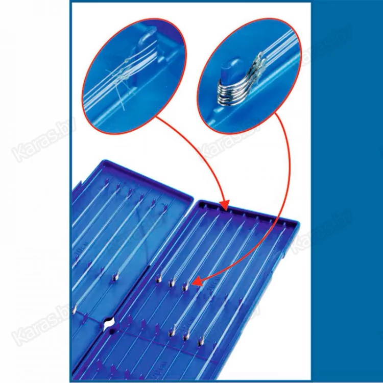 Поводочница для хранения поводков размером от 7 до 20 см. Компактная и сверхлегкая, она имеет 13 крепежных положений и может вмещать более 100 поводков, готовых к использованию. Размер опорных штифтов достаточен как по диаметру, так и по длине, чтобы можно было закрепить крючки и петли даже небольших размеров. Длина поводков четко указана внутри поводочницы.