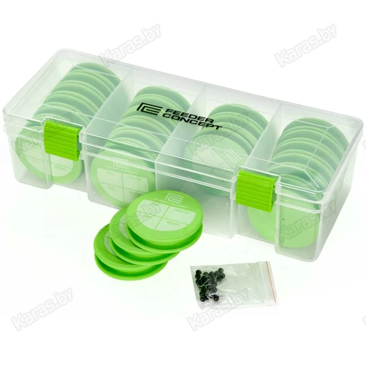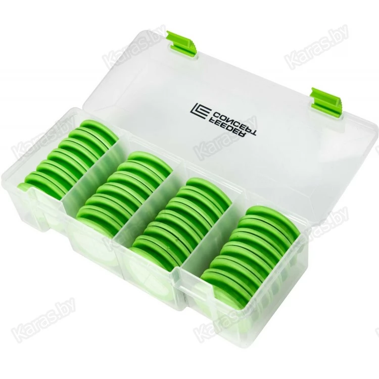 Пластиковая коробка с круглыми мотовилами из материала EVA для хранения и транспортировки готовых фидерных поводков. В коробке находятся 24 мотовила диаметром 65мм, каждое мотовило укомплектовано булавкой для фиксации поводка. Хранение поводков на мотовилах круглой формы более предпочтительно, так как в этом случае поводок всегда остаётся ровным, и на нём не появляются "заломы", что характерно для мотовил другой формы.
