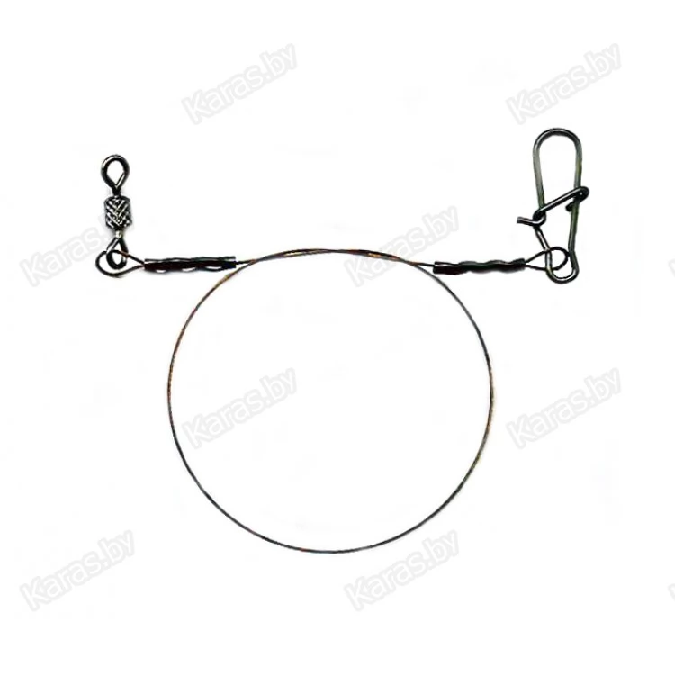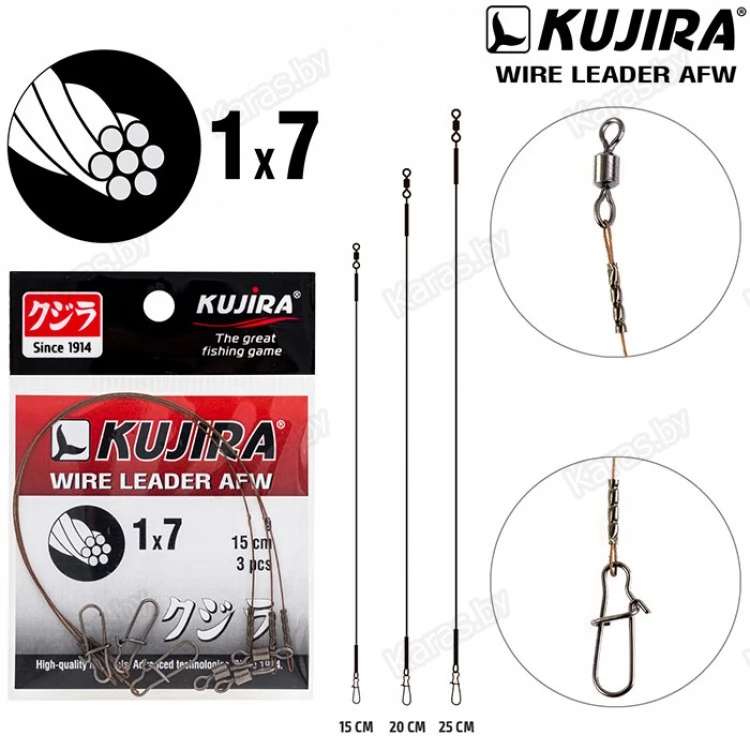 Материал для поводков Kujira свит из тончайшей проволоки  производства AFW, выполненной из нержавеющей стали. Поводок оснащен застежкой и качественным вертлюжком. Поводок выпускается в нескольких сериях: 1x7 - (7 сплетенных нитей) – серия отличается наибольшей жесткостью, что позволяет лучше чувствовать приманку на дальних дистанциях заброса.
