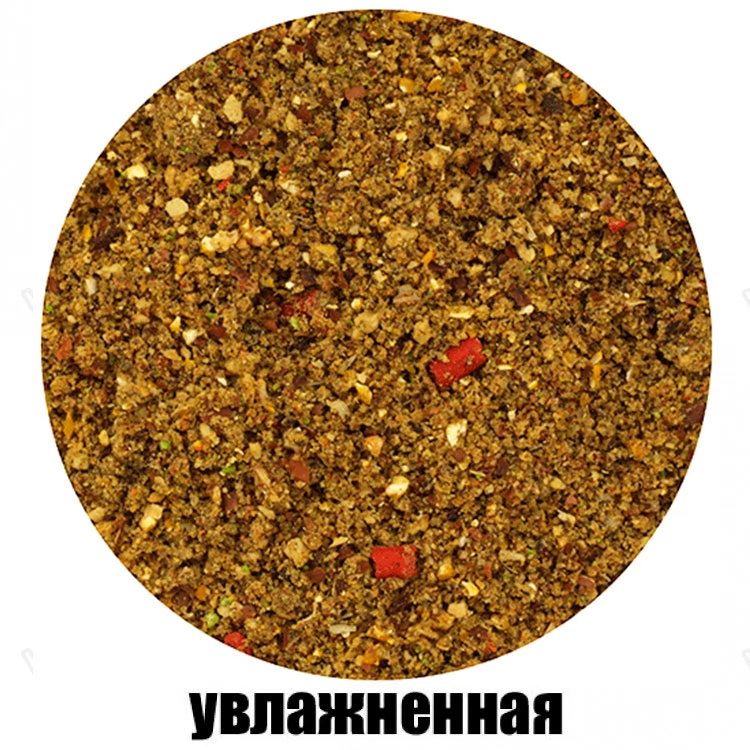 Грубого помола смесь для ловли трофейной рыбы на реке. Содержит разнообразные крупные кормовые частицы. Цвет смеси — жёлто-бежевый.
