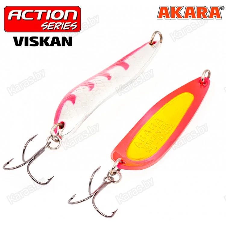 Akara Action Series Viskan – блесна разработана, прежде всего для ловли лососевых. Узкое тяжелое тело обеспечивает отличные полетные характеристики для точного и дальнего заброса, а характерный загиб гарантирует стабильную игру в струе. Приманка отличается резкой, агрессивной игрой, заводится с первых сантиметров проводки. Трофеями Viskan являются: семга, кумжа, чавыча, сима и таймень. В центральной России к ней не останутся равнодушными жерех, щука и судак.