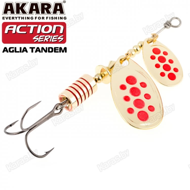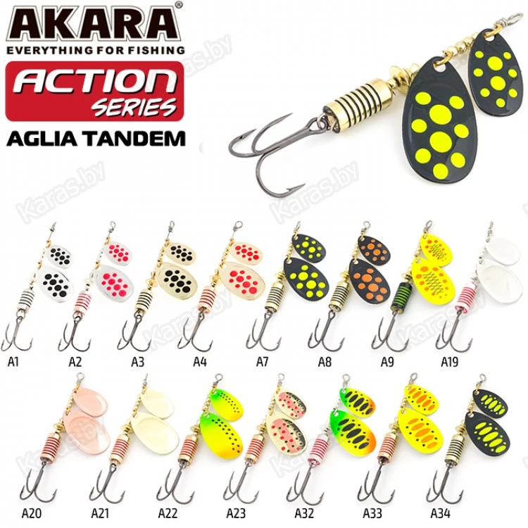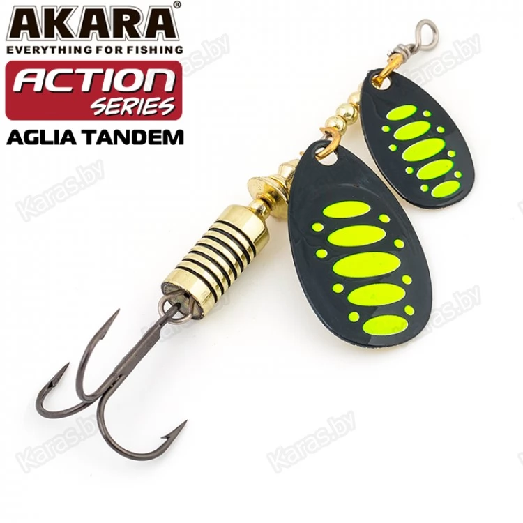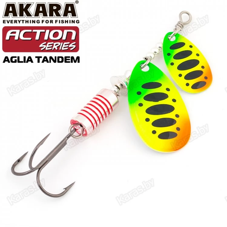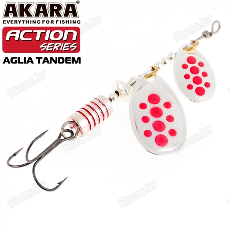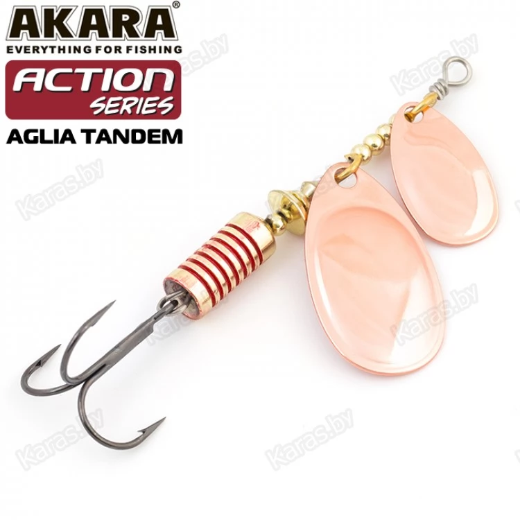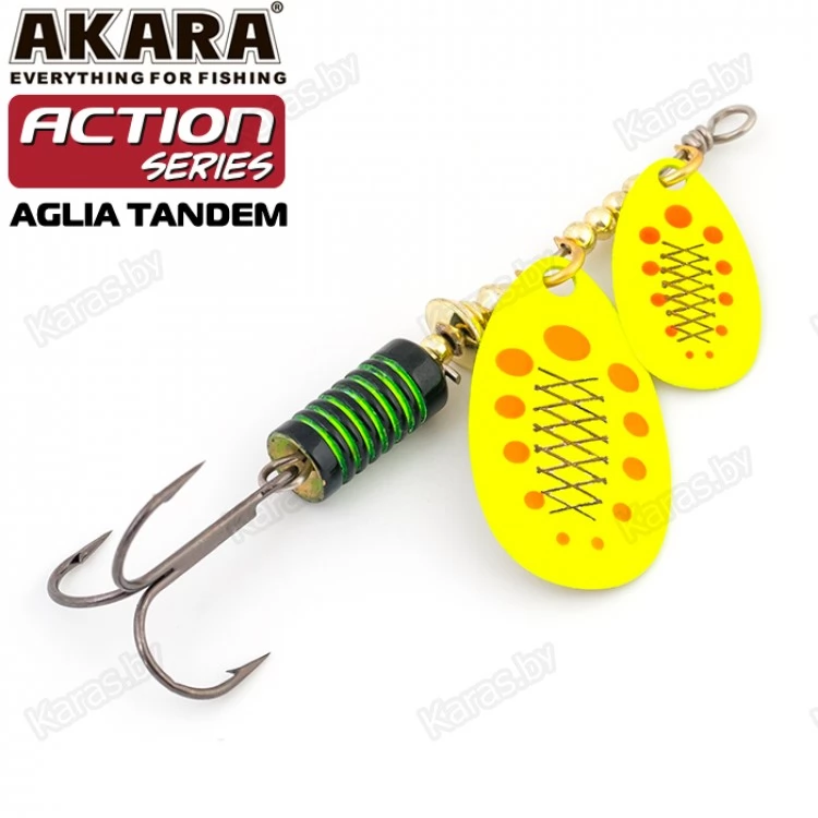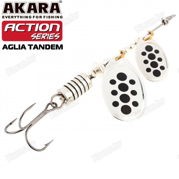Блесны этой серии обладают невероятно активной игрой благодаря своему строению. Action Series Aglia Tandem оснащена двумя овальными лепестками. Они активно вращаются во время движения, поэтому у приманки нет шансов остаться незамеченной. Сердечник отвечает за дальность заброса и уравновешивает игру. Как и все колеблющиеся блесны, Action Series Aglia Tandem универсальна и подходит для разных водоемов. Проводку можно выполнять на минимальной скорости. Яркие окраски лепестка с пятнами и полосками сделают приманку еще более заметной в воде. Также есть в серии модели с лепестками без рисунка, они красиво переливаются во время движения.