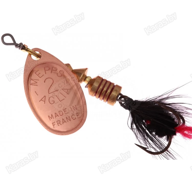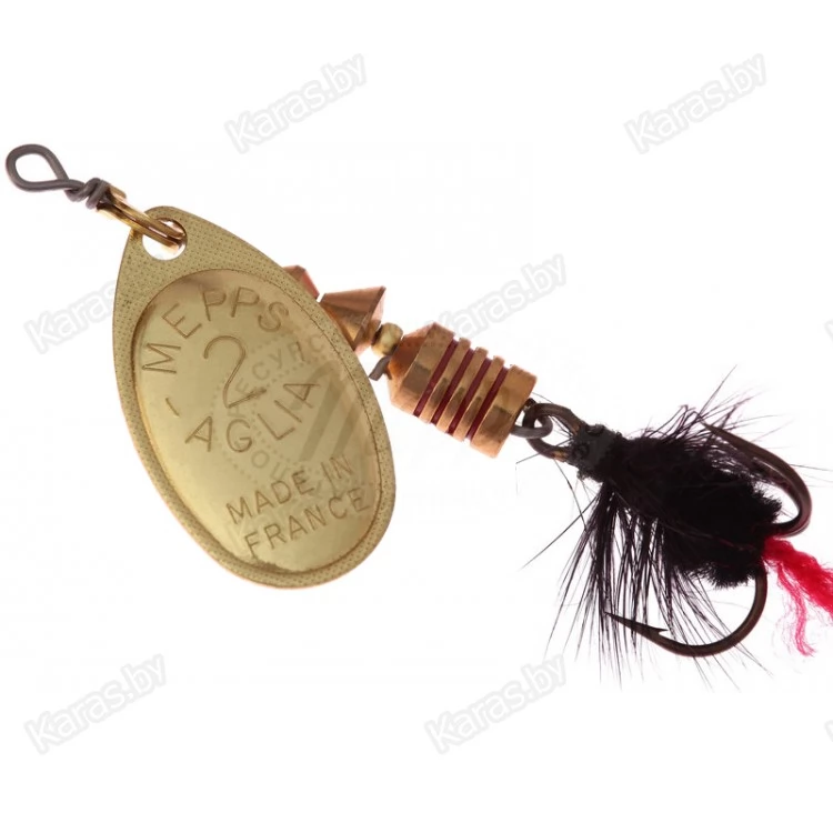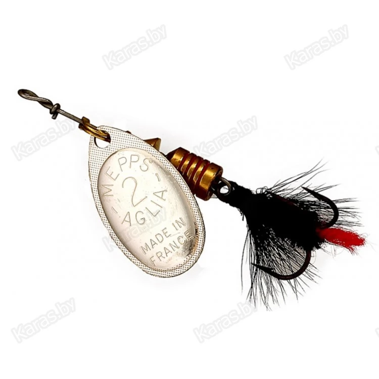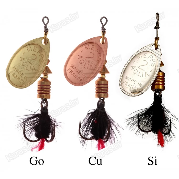 MEPPS AGLIA MOUCHE — разновидность МОДЕЛИ AGLIA со стандартными окрасками лепестков: серебряным, золотым, медным и черным. На тройниках блесен: рыжие и черные мушки ручной вязки из меха беличьего хвоста. Это очень эффективные приманки для ловли жереха, хариуса, голавля, язя, окуня и других видов рыб, особенно в периоды массового вылета насекомых. AGLIA MOUCHE — некрупные блесны. Они выпускаются четырех размеров: от №00 до №2.