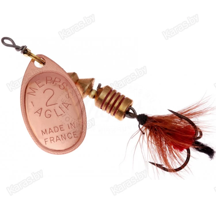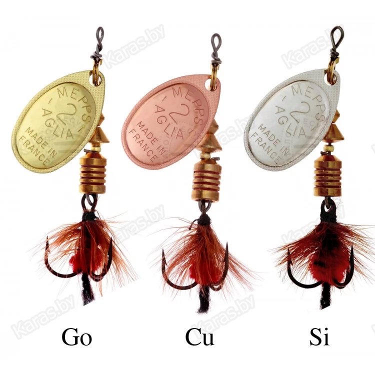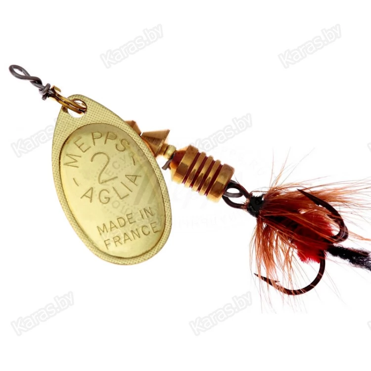 MEPPS AGLIA MOUCHE — разновидность МОДЕЛИ AGLIA со стандартными окрасками лепестков: серебряным, золотым, медным и черным. На тройниках блесен: рыжие и черные мушки ручной вязки из меха беличьего хвоста. Это очень эффективные приманки для ловли жереха, хариуса, голавля, язя, окуня и других видов рыб, особенно в периоды массового вылета насекомых. AGLIA MOUCHE — некрупные блесны. Они выпускаются четырех размеров: от №00 до №2.