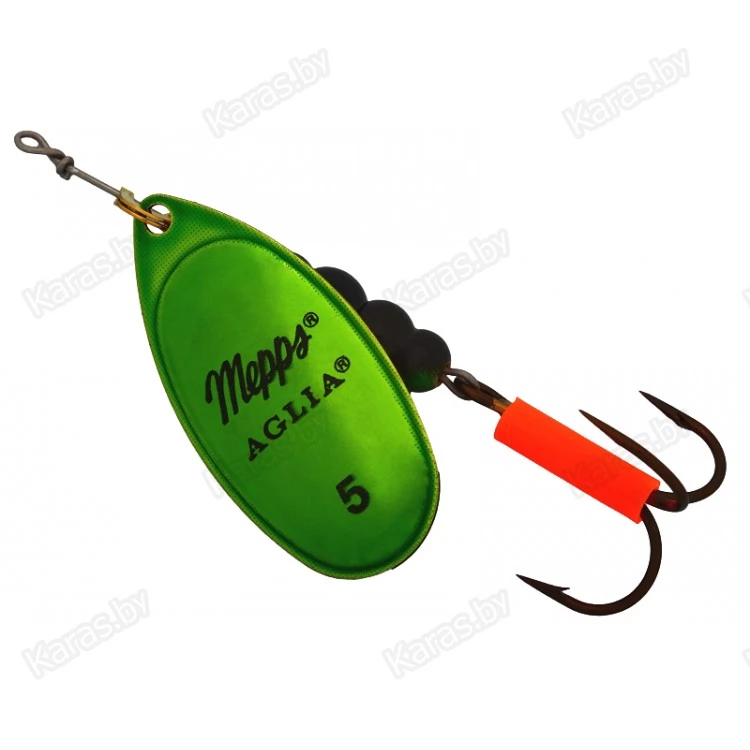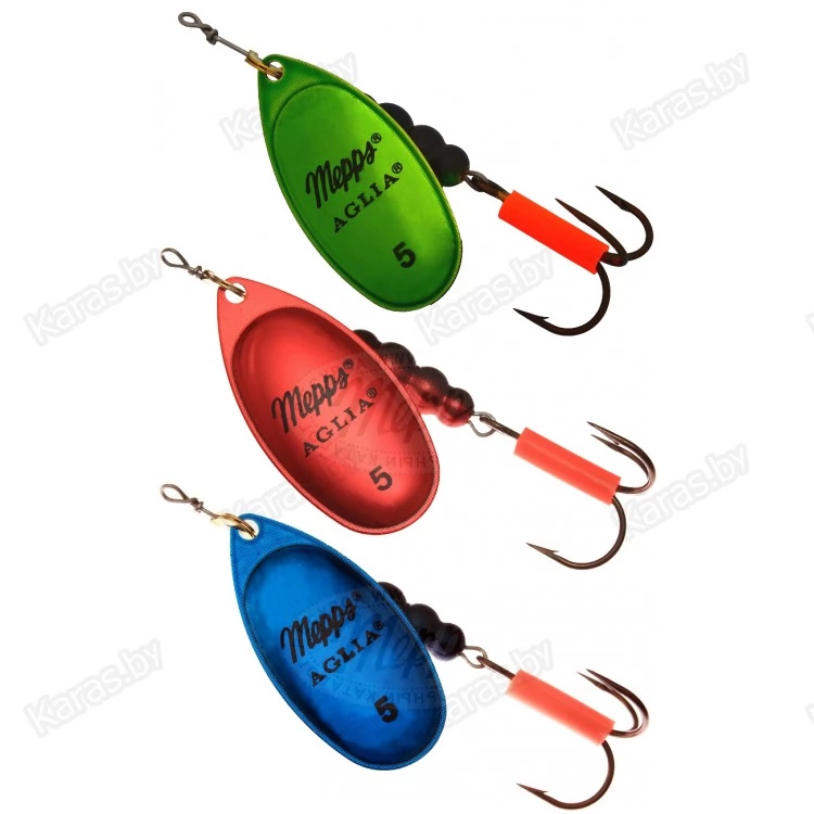 Лепестки MEPPS AGLIA PLATINUM окрашены в зеленый, синий и красный цвета. Они имеют глянцевую поверхность и напоминают расцветки хитиновых покровов насекомых. Аналогично окрашены сердечники блесен. Несмотря на рекомендации по их использованию, связанные с такими факторами, как сезон ловли, прозрачность воды, глубина и т.п., опытные рыболовы-практики советуют чаще экспериментировать с данным видом приманок. Нередко, AGLIA PLATINUM преподносит сюрпризы, о которых не приходилось и мечтать.