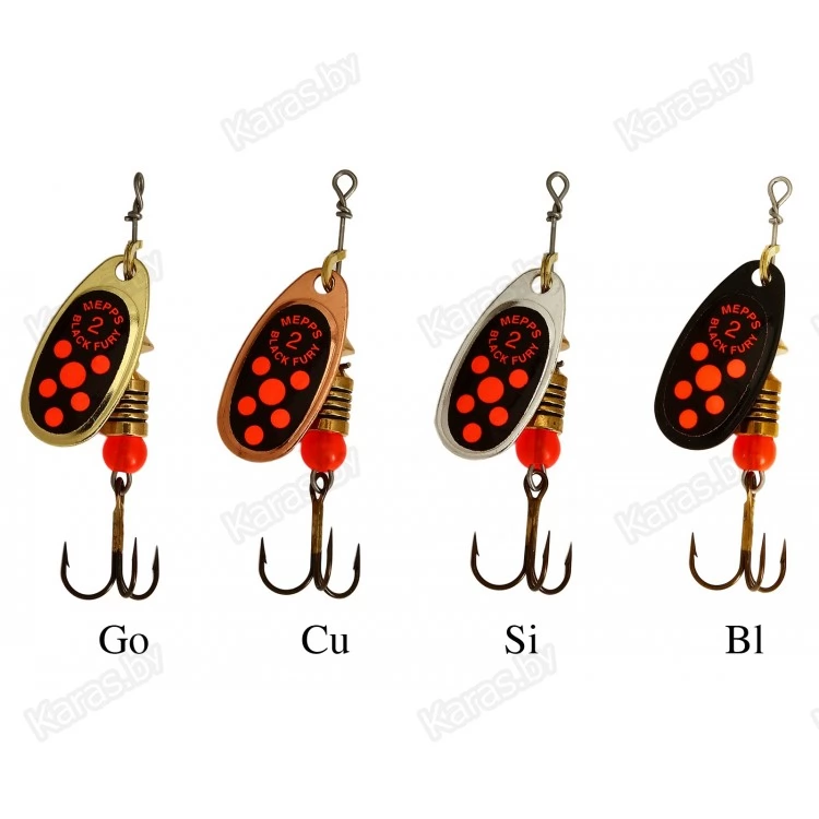 MEPPS предлагает COMET BLACK FURY, как одну из самых уловистых форелевых блесен. Тем не менее, по опыту российских рыболовов, эта разновидность COMET не только подходит для ловли большинства видов рыб, но и в целом ряде случаев не имеет себе равных. Дословно BLACK FURY переводится, как «черная бешеная» или «суматошная чернушка». Все разновидности оснащаются лепестками серебряного, золотого, медного и черного цветов. Между собой они различаются по окраске точек на черном фоне наклеек, расположенных с внешней стороны лепестков.