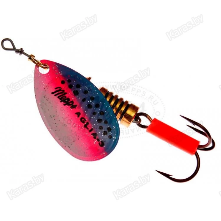 Окраска Aglia Rainbow Trout появились относительно недавно. Она не имитация конкретного водного объекта, а сумма рефлекторных элементов, провоцирующих нападение хищника. Внешняя сторона лепестка напоминает раскраску радужной форели. Но это не основное её отличие. При вращении лепестка этой блесны, имитирующие окраски не сохраняются. Они лишь придают своеобразные оттенки движущейся приманке. Основным рефлекторным элементом внешней поверхности лепестка является мелкий кристаллический элемент со 100% отражением света. Под водой множественные микросигналы, характерные для привычной добычи, дополнительно провоцируют хищника. Внутренняя поверхность лепестка серебряного цвета. Результатом испытаний этих приманок на российских водоемах стали очень хорошие отзывы многих рыболовов. Учитывая то, что Rainbow имеют все базовые размеры Aglia, она пригодна для спиннинговой охоты на большинство видов рыб.