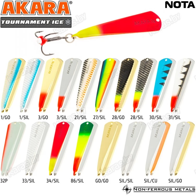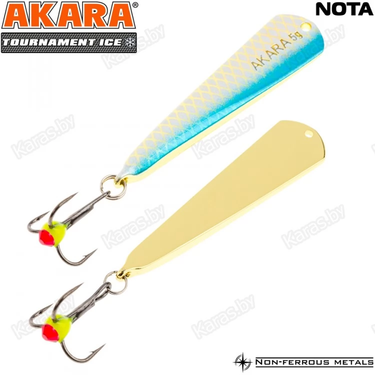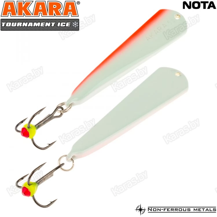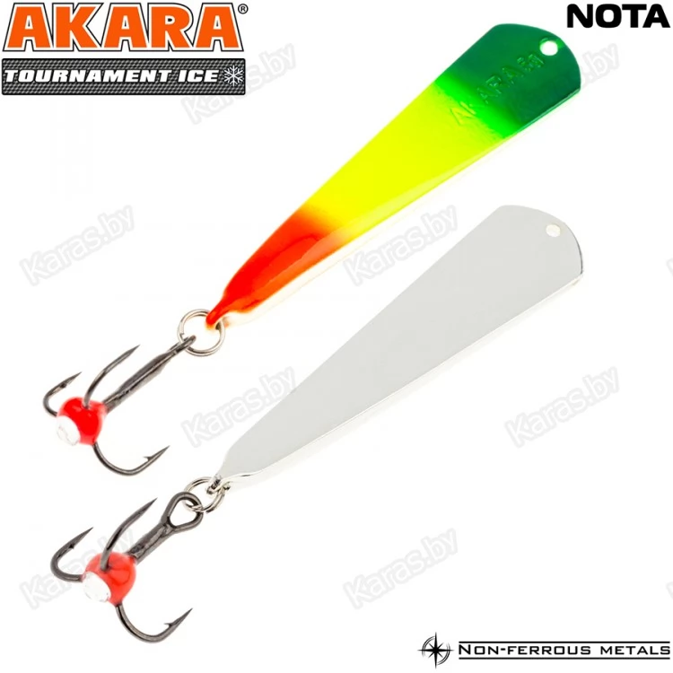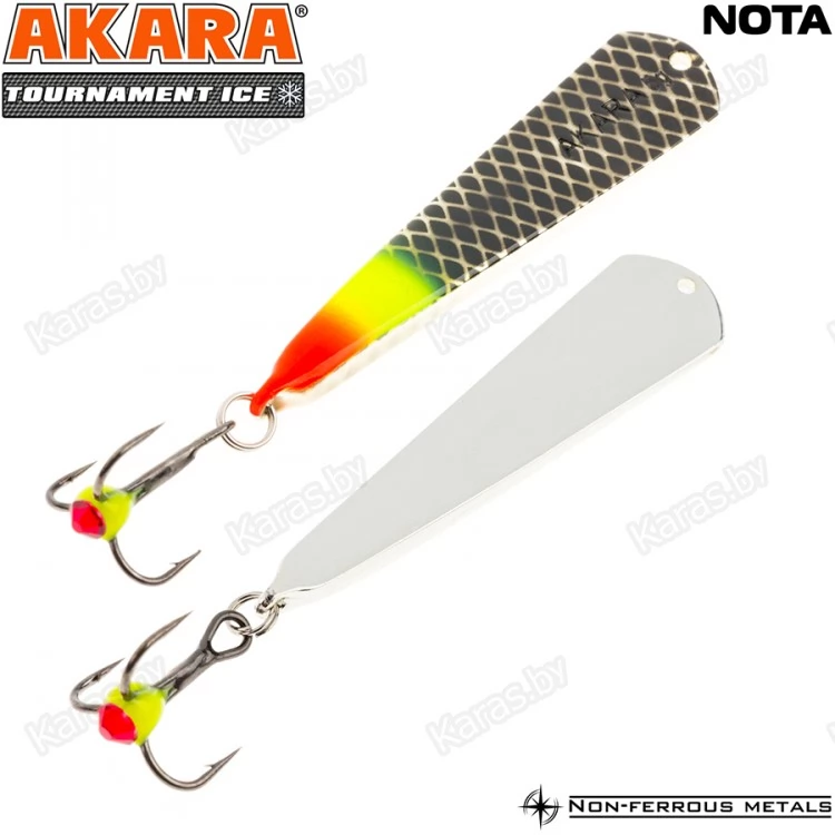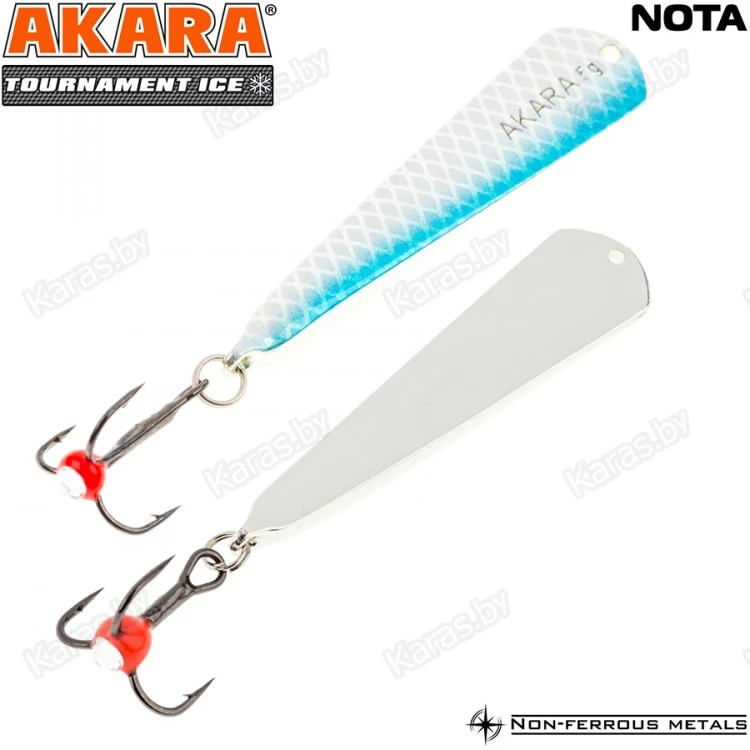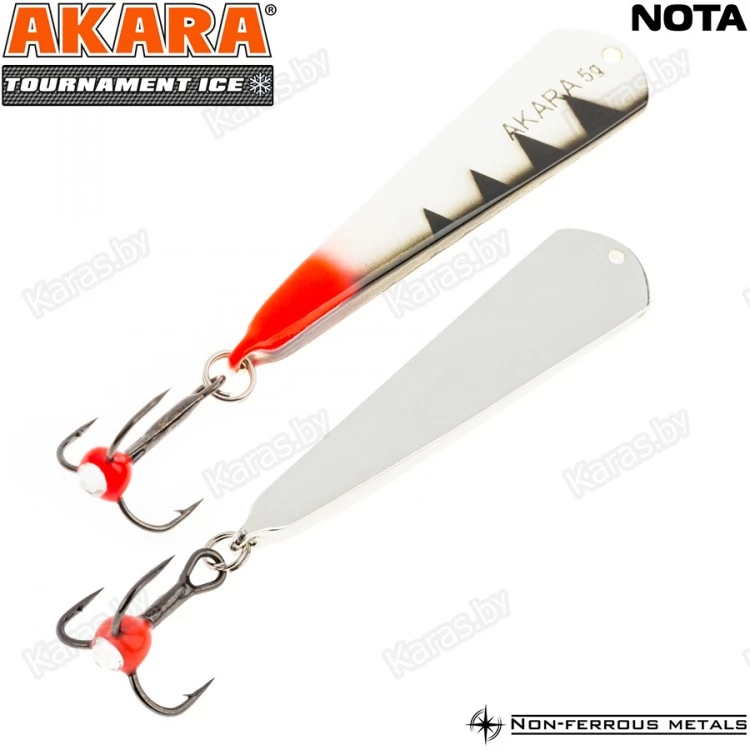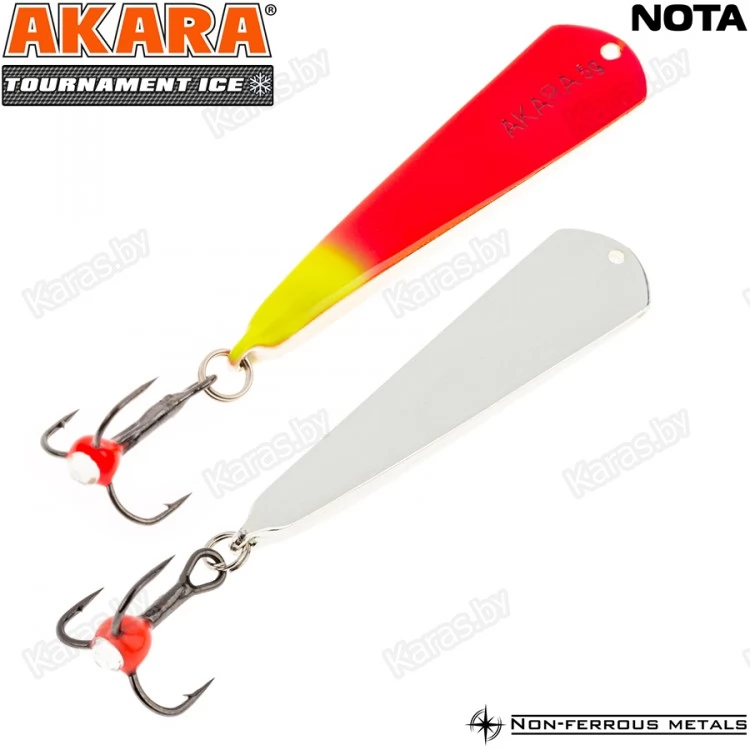 Блесна зимняя Akara Tournament Ice Nota выпускается в двух размерах 35 и 45 мм и в основном рассчитана на ловлю окуня. Отличается гвоздящей игрой и отлично работает по активной рыбе. При широких взмахах имеет отклонение в сторону, что так же привлекает рыбу.