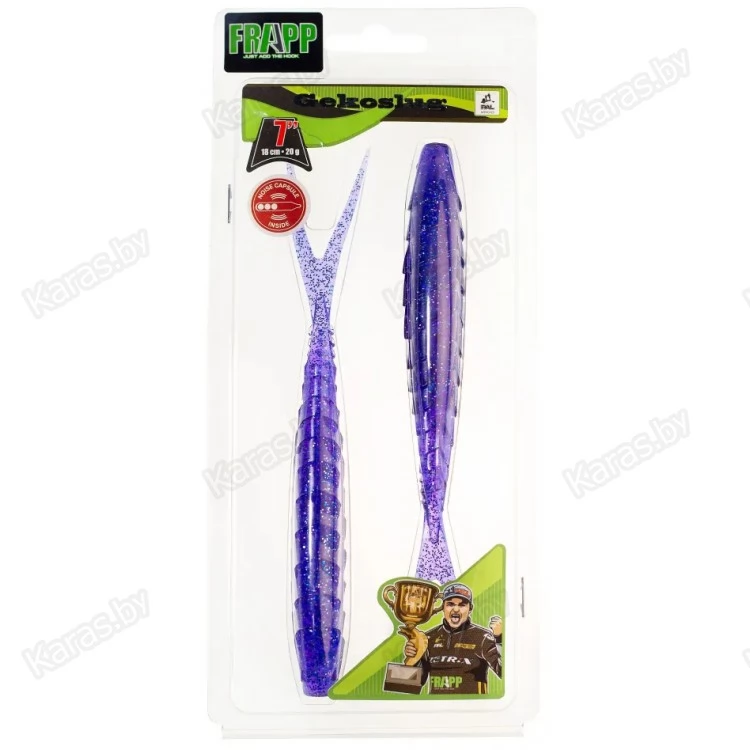 Gekoslug — новый слаг в линейке FRAPP, с широкими возможностями анимации, адаптированный для выполнения дальних и точных забросов. Выпускается в трех размерах: 7, 8 и 9 дюймов. Все приманки снабжены шумовыми капсулами. Gekoslug — приманка с округлой в сечении передней частью, рельефной «чешуйчатой» поверхностью и подвижным V-образным хвостиком. Благодаря такой геометрии, Gekoslug обладает очень хорошими полетными характеристиками: даже с минимальной огрузкой при забросе он устойчив к боковым порывам ветра, летит далеко и точно в самых разных условиях. При рывковой и монотонной равномерной анимации Gekoslug не рыскает и не заваливается — приманка максимально сохраняет прямую траекторию движения. При этом и погружается на паузах слаг почти вертикально, без «спиральной составляющей».