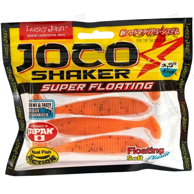 Joco Shaker Super Floating - «съедобная» плавающая приманка с классической формой виброхвоста и с ребристой поверхностью тела. Эта первая приманка из серии «съедобной резины» Lucky John с системой плавающего мягкого пластика - Floating Soft Plastic System. Материал приманки имеет очень низкую плотность, поэтому он всегда легче воды. Не смотря на мягкость приманки, её материал прочен и устойчив к щучьим зубам. Приманка не утратит своих плавающих свойств при многократном её использовании на различных оснастках и после щучьих «ранений». В тело приманки внедрён аттрактант со вкусом макрели, который в жидкой форме, дополнительно нанесён и на её поверхность.