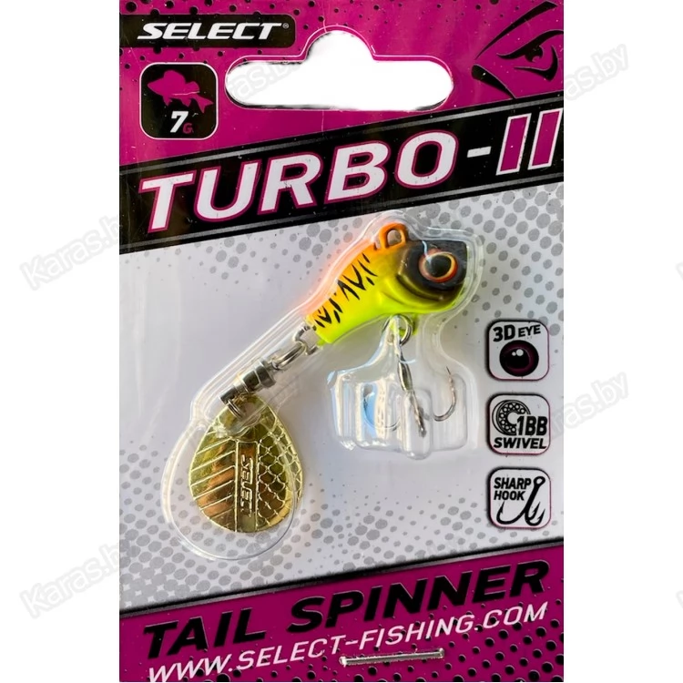 Тейл-спиннер Select Turbo-II - обновлённая и доработанная модель популярной приманки, которая пользуется большой популярностью среди рыболовов. Он объединяет в себе вертушку, пилкер и раттлин по своей работе, но в то же время, имеет свои особенности. Тяжелое компактное свинцовое тело в форме рыбки позволяет делать максимально дальние забросы. Даже встречный или боковой ветер не помешает доставить приманку туда куда нужно. В тейл-спиннере используется стандартный каплеобразный лепесток, смонтированный на вертлюжке с подшипником, что обеспечивает легкий старт приманки и ее стабильную работу. Специальный кембрик в месте крепления лепестка предотвращает его перехлёст во время заброса. Select Turbo можно спокойно назвать джиговой вертушкой, ведь ее основной рабочий горизонт - это придонные участки. Еще одно преимущество данной приманки - она совсем не крутит шнур. Во время проводки лепесток вращается, а тело активно вибрирует и стабилизирует положение блесны в воде.