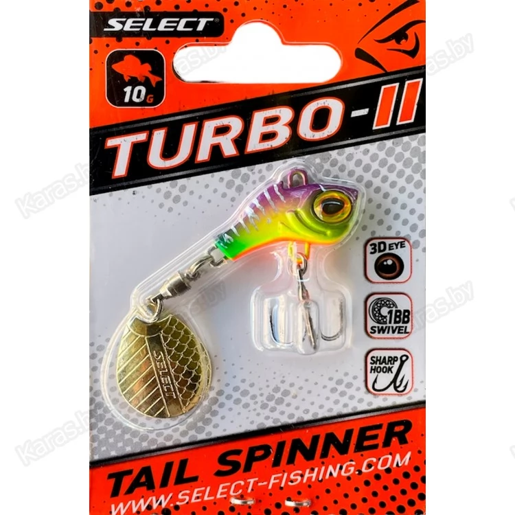 Тейл-спиннер Select Turbo-II - обновлённая и доработанная модель популярной приманки, которая пользуется большой популярностью среди рыболовов. Он объединяет в себе вертушку, пилкер и раттлин по своей работе, но в то же время, имеет свои особенности. Тяжелое компактное свинцовое тело в форме рыбки позволяет делать максимально дальние забросы. Даже встречный или боковой ветер не помешает доставить приманку туда куда нужно. В тейл-спиннере используется стандартный каплеобразный лепесток, смонтированный на вертлюжке с подшипником, что обеспечивает легкий старт приманки и ее стабильную работу. Специальный кембрик в месте крепления лепестка предотвращает его перехлёст во время заброса. Select Turbo можно спокойно назвать джиговой вертушкой, ведь ее основной рабочий горизонт - это придонные участки. Еще одно преимущество данной приманки - она совсем не крутит шнур. Во время проводки лепесток вращается, а тело активно вибрирует и стабилизирует положение блесны в воде.