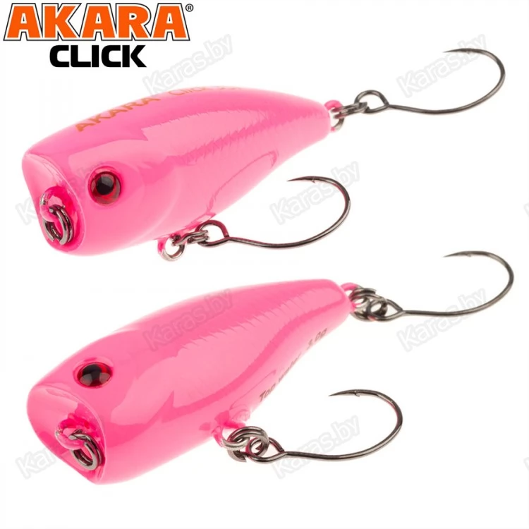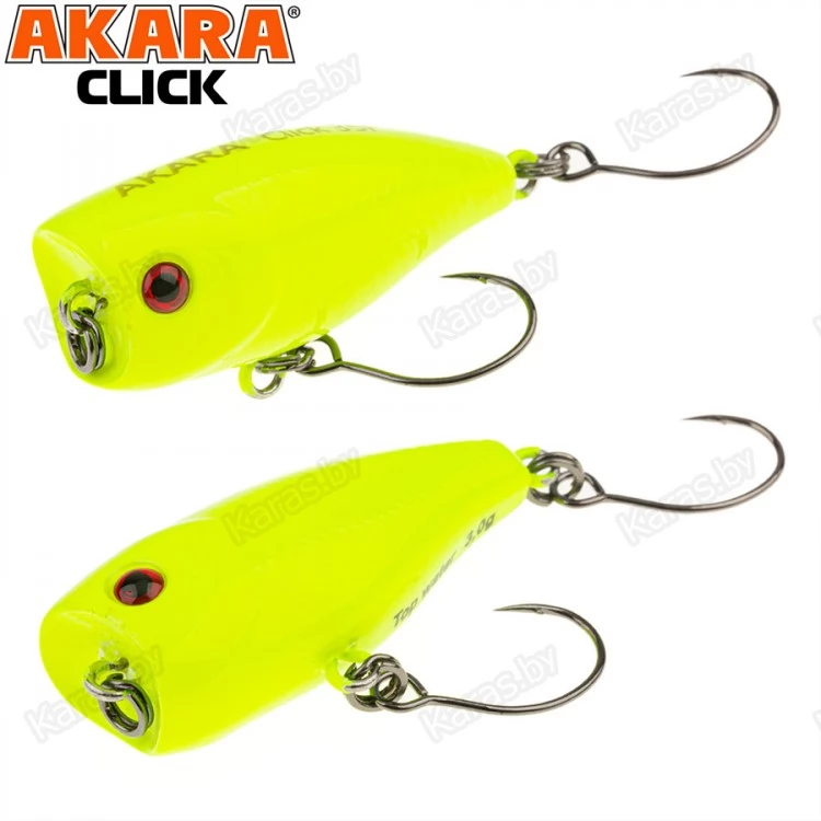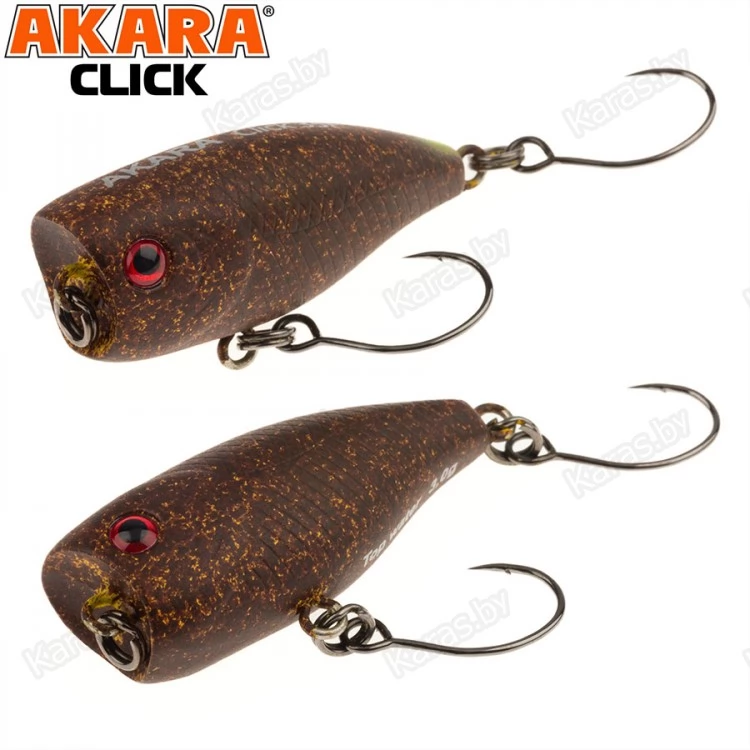 Воблер Akara Click - небольшой поппер завоевал большую популярность при ловле прудовой форели. Небольшой и компактный размер позволяет далеко забросить приманку на тонком шнуре. Игра может быть очень разнообразная. От обычных стандартных бульков с паузами, до еле заметных коротких потяжек, от которых поппер едва шевельнется и пустит небольшую волну по поверхности воды. Естественно, что кроме форели приманка отлично подойдёт и для ловли окуня. В этом случае лучше подойдёт более агрессивная проводка. Акустический. Плавающий. Поверхностный.