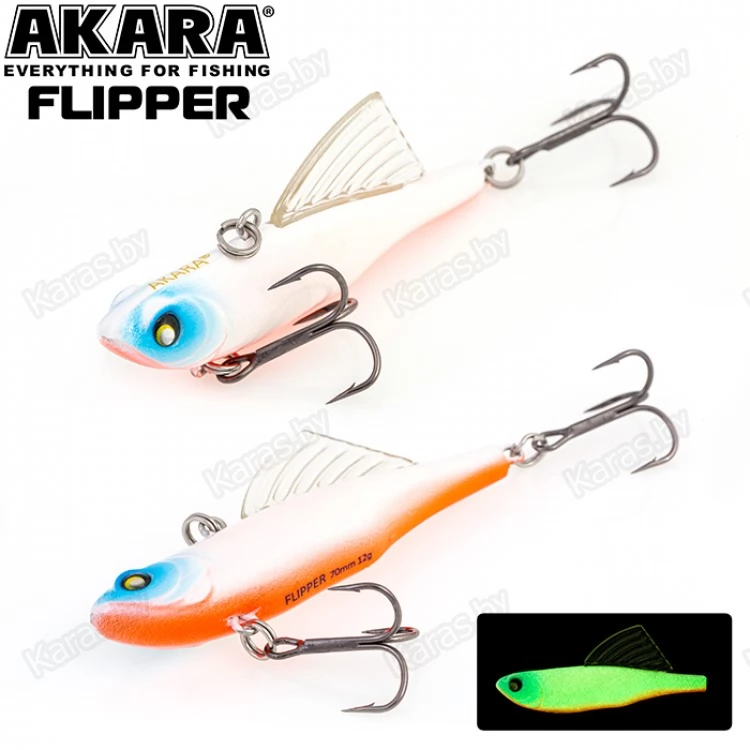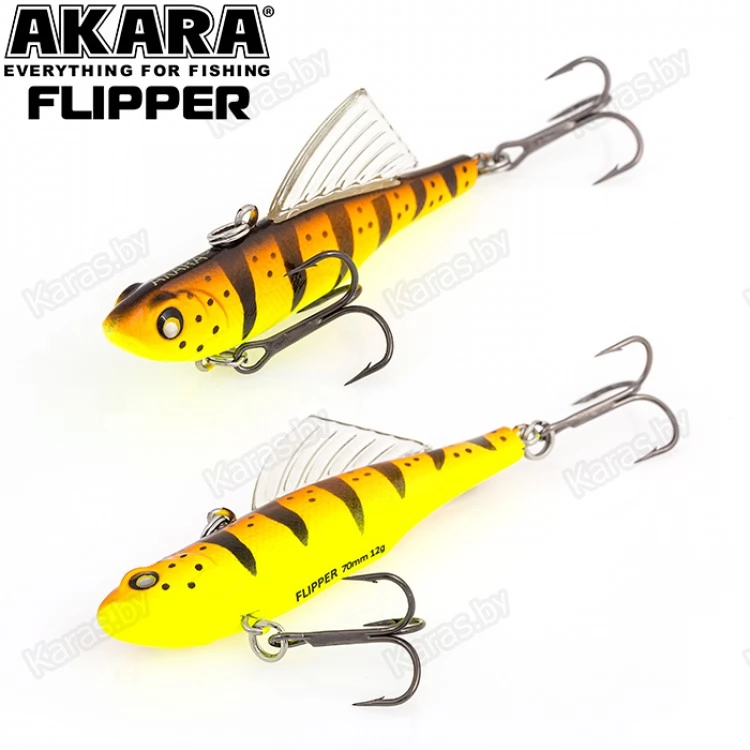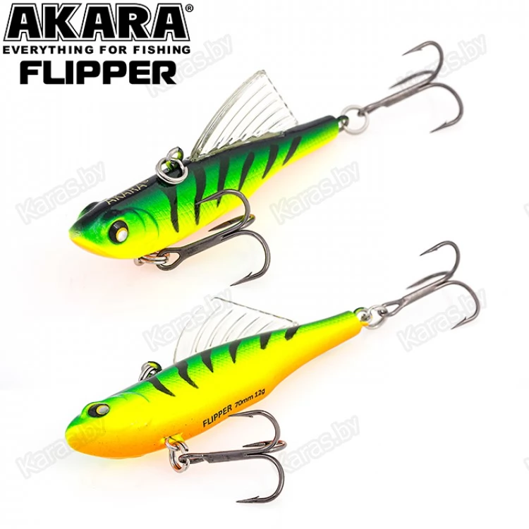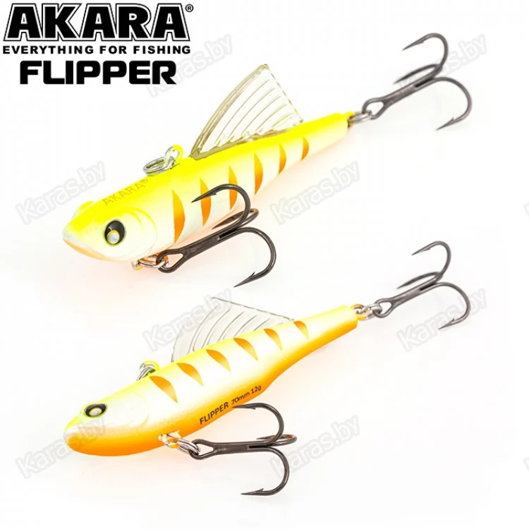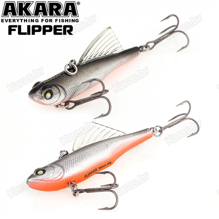 Зимний воблер Akara Flipper обладает оригинальной конструкцией, отличающей его от других вибов и раттлинов. Как и у остальных раттлинов, крепежное отверстие для лески у Flipper расположено на спине, а основной особенностью является, располагающийся за креплением крупный спинной плавник, благодаря которому воблер имеет уникальную игру, позволяющую добиться результата, там, где другие приманки не столь эффективны. На горизонтальной, так называемой летней проводке, данный воблер показывает среднеамплитудную и среднечастотную игру, благодаря которой Akara Flipper становиться серьезным оружием на летней рыбалке, а на вертикальной, зимней, игре балансир демонстрирует высокочастотную низкоамплитудную игру свойственную раттлинам эффективную по зимнему судаку. Akara Flipper имеет длину 70 мм, вес 12 грамм. Тонущий. Акустический.