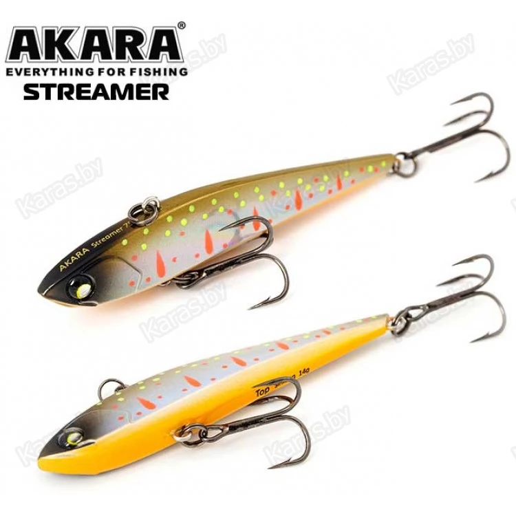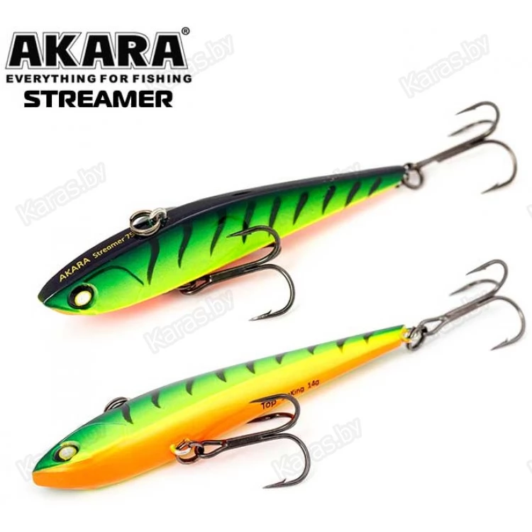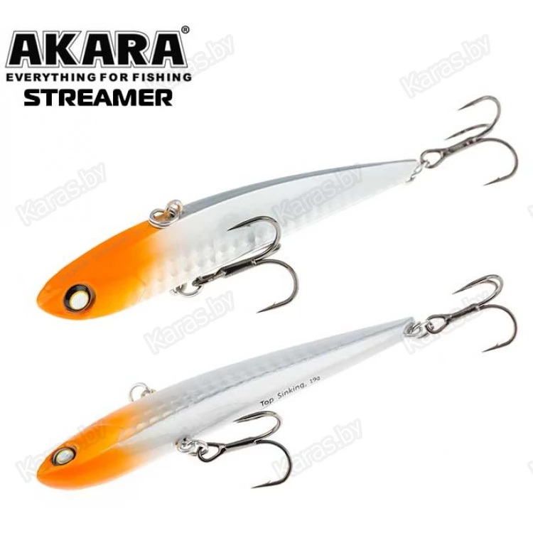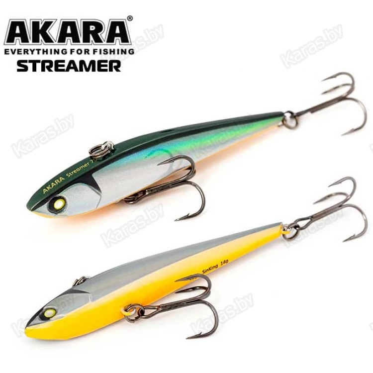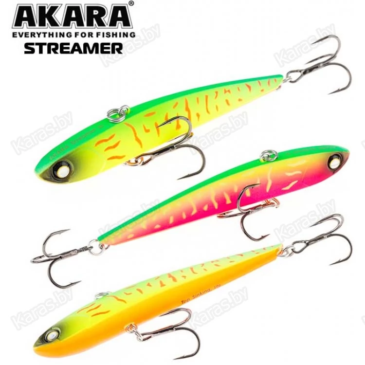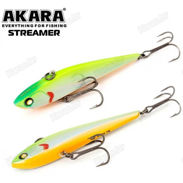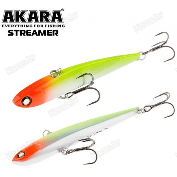 Akara Streamer - безлопастный воблер класса раттлин (rattlin). Приманка с прогонистой формой тела предназначена для отвесной ловли судака и окуня, а также других хищных рыб. Стабильно работает на водоемах любого типа, отлично держит сильное течение, не входит в штопор. Высокочастотная игра привлекает рыбу с дальних дистанций. Тип плавучести - быстротонущий.