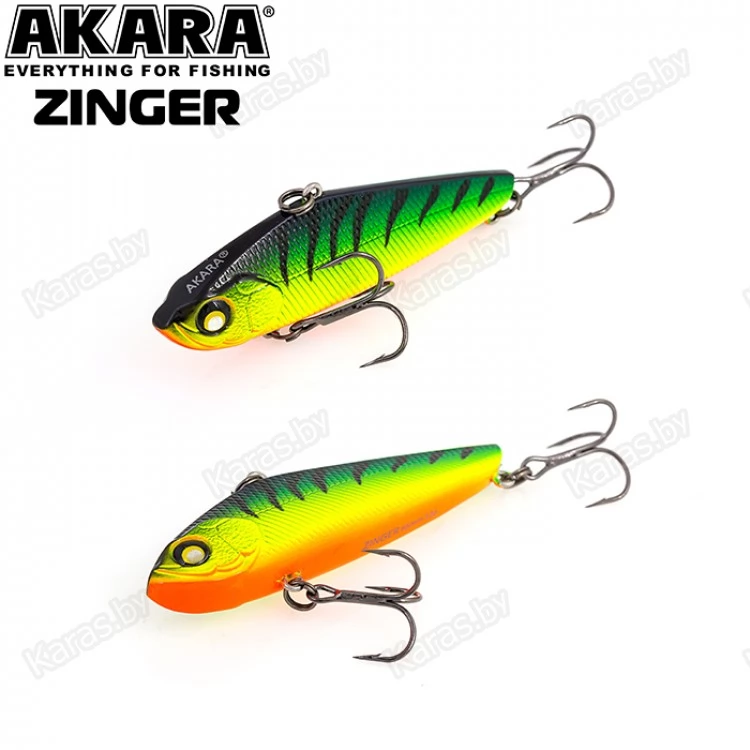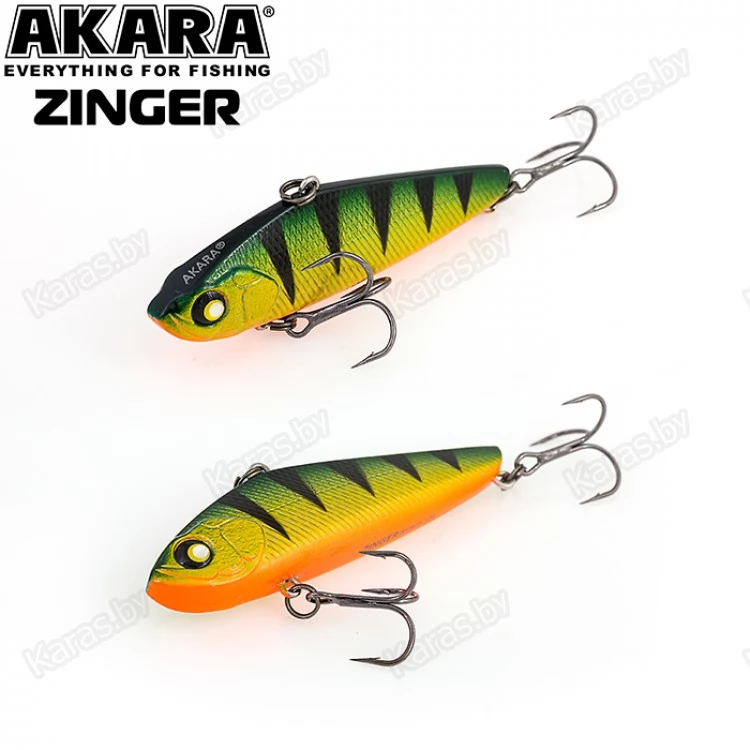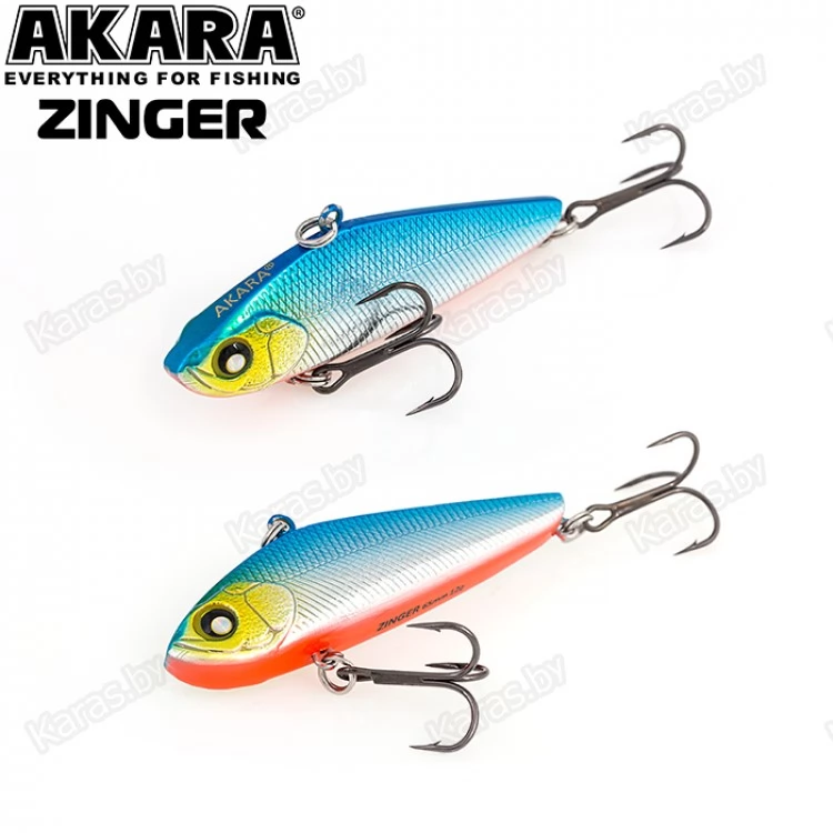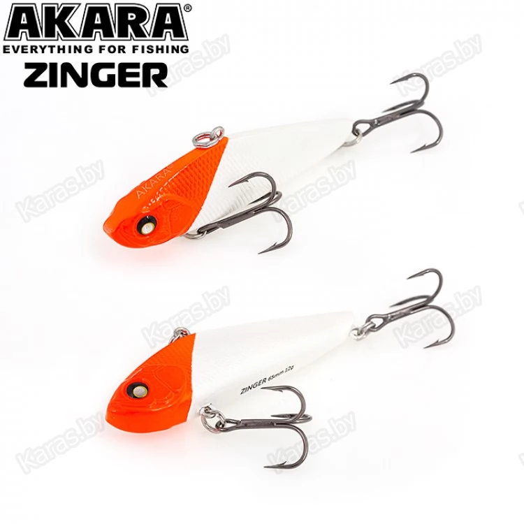 Отличие зимнего воблера от воблеров применяемых для летнего лова хищных рыб заключается в том, что крепление лески, шнура или поводка осуществляется не к голове приманки, а спине, благодаря чему при горизонтальной проводке и вертикальных подбросках воблер демонстрирует высокочастотную мелкоамплитудную игру. На такую игру, напоминающую тряску, очень хорошо реагирует судак, который и является основной добычей этого воблера. Зимний воблер (другие названия раттлин или виб) Akara Zinger, имеет классическую форму и превосходную игру, он хорош тем, что практически моментально заводится и не требует специальных навыков при проводке. Воблер универсальный и одинаково успешно работает в любой сезон, на различных глубинах, на вертикальных подбросках и при горизонтальной проводке. Akara Zinger выпускается в двух размерах 60 и 65 мм, весом 9 и 12 грамм. Тонущий. Акустический.