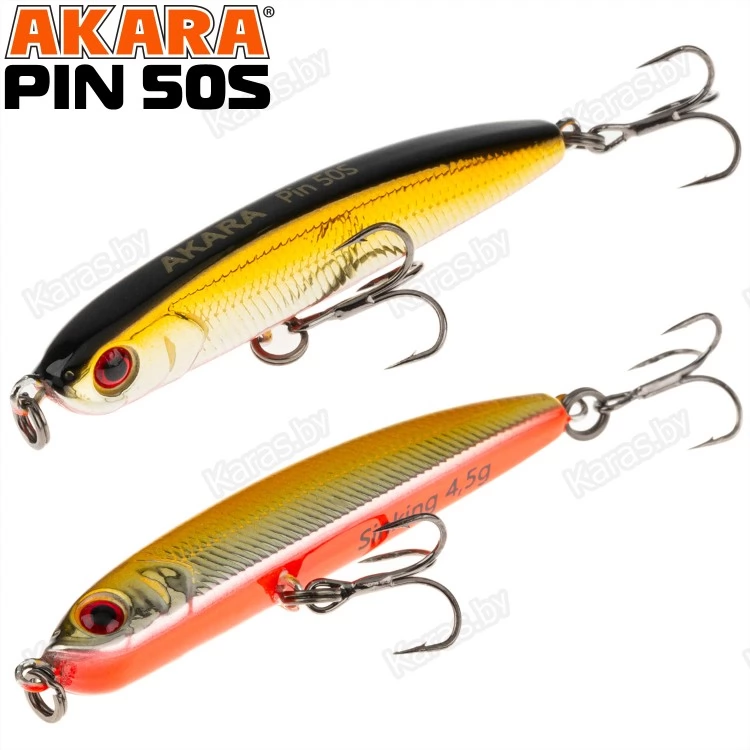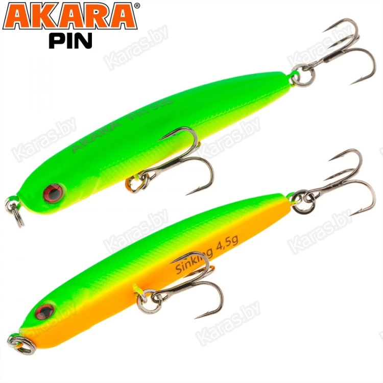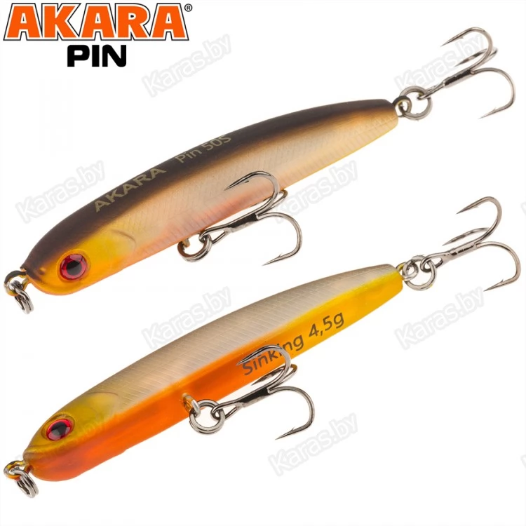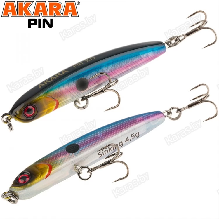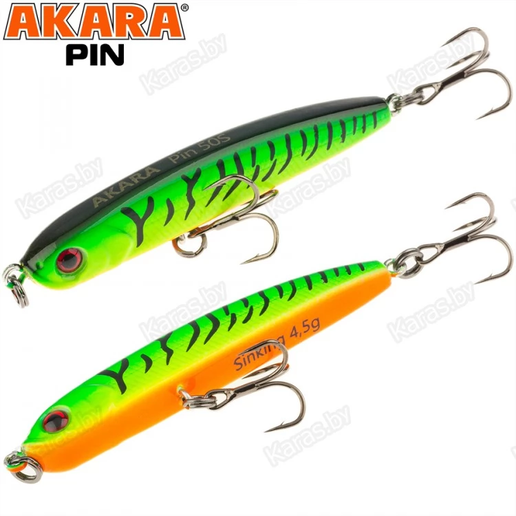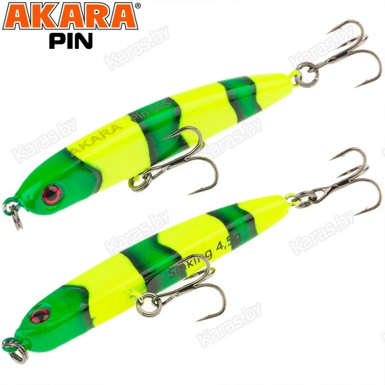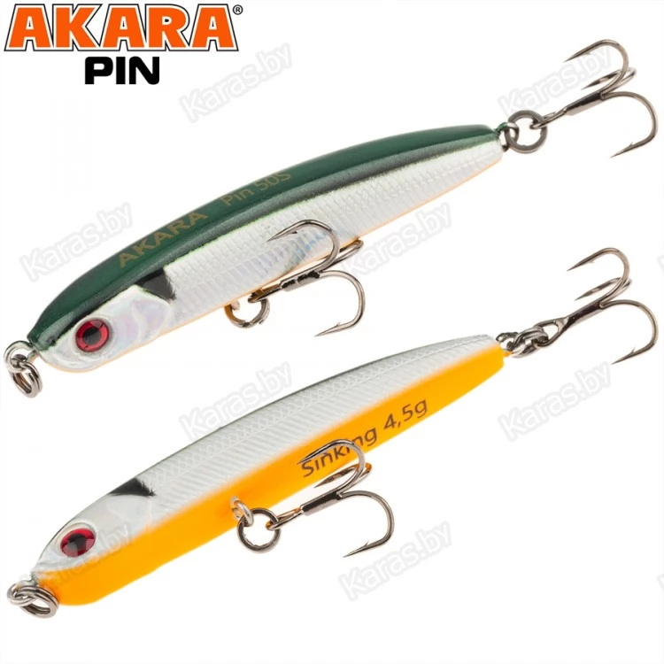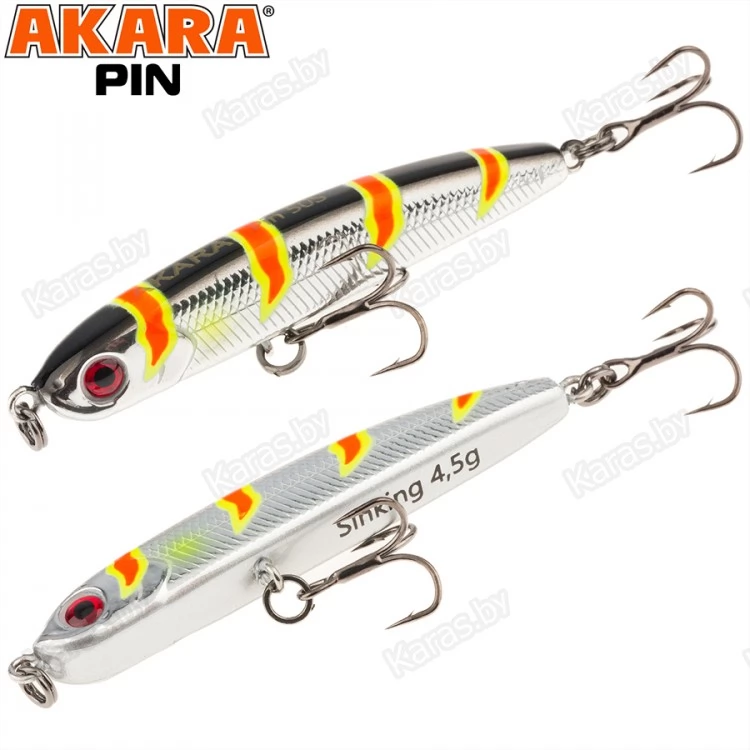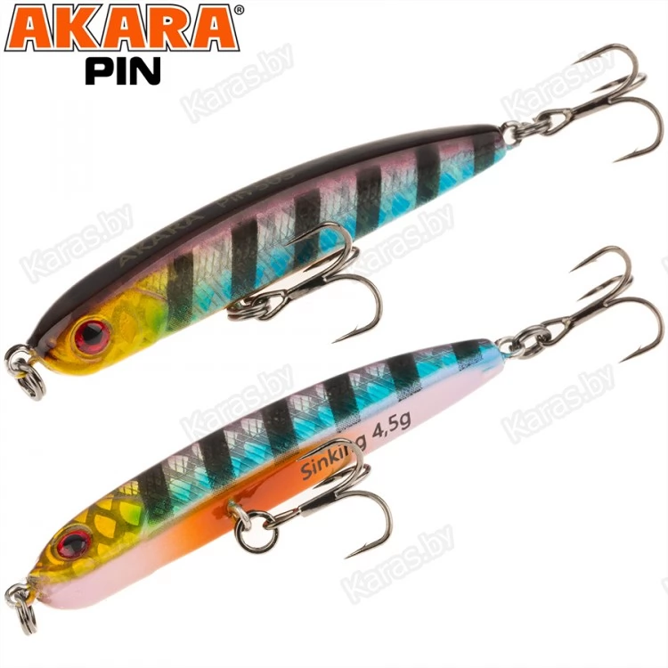 Воблер Akara Pin - даже при ловле в окуневых котлах не всегда получается удачная рыбалка. Чаще всего это происходит потому, что приманка сильно отличается от малька, за которым охотится окунь. Не обязательно попасть в цвет, но форма и размер приманки должны соответствовать пищевому объекту окуня. Akara Pin здесь приходится очень кстати. Стик рассчитан на рывковую проводку с паузами. На паузах приманка тонет и покачивает боками, изображая обессилившую добычу. Полосатый разбойник не может устоять против такого приема. Тонущий.
