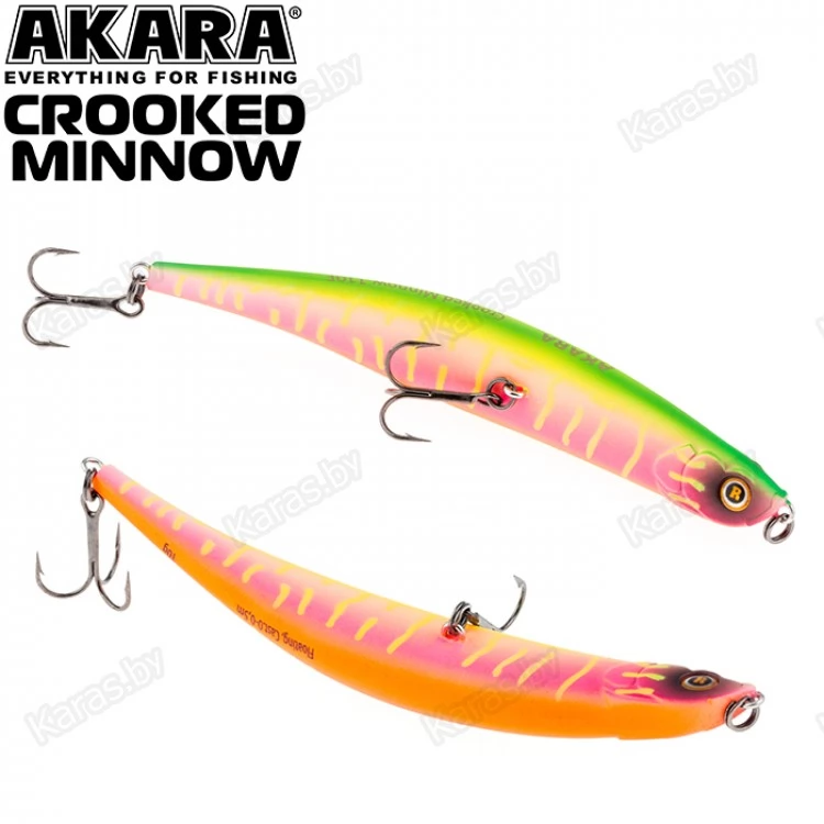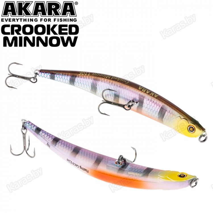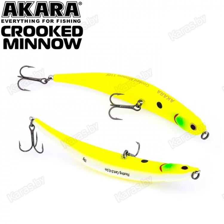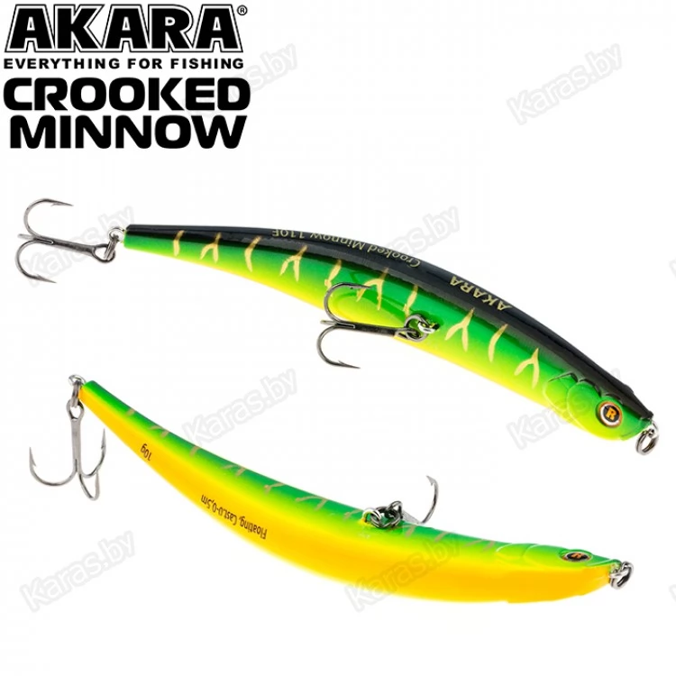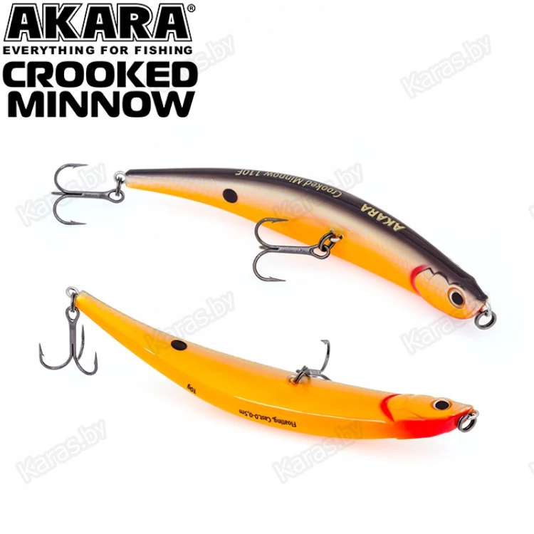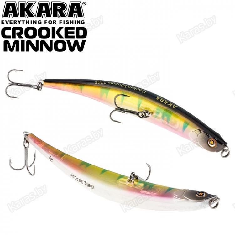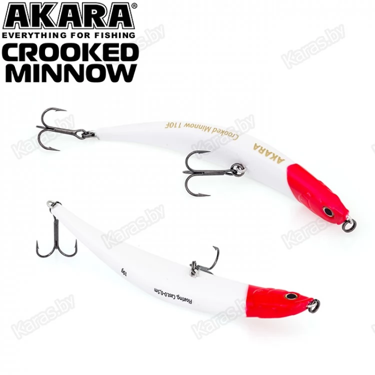 Akara Crooked Minnow 110F – плавающий безлопастной воблер оригинальной формы длиной 110 мм. Отлично подходит для ловли по небольшим глубинам. Неповторимая игра на рывковой проводке позволяет облавливать даже маленькие окошки среди водной растительности. Допускает равномерную проводку. Основным объектом ловли для этой приманки выступает щука, а также окунь. Заглубление до 0,5 м. Оснащен крючками из высокоуглеродистой стали.