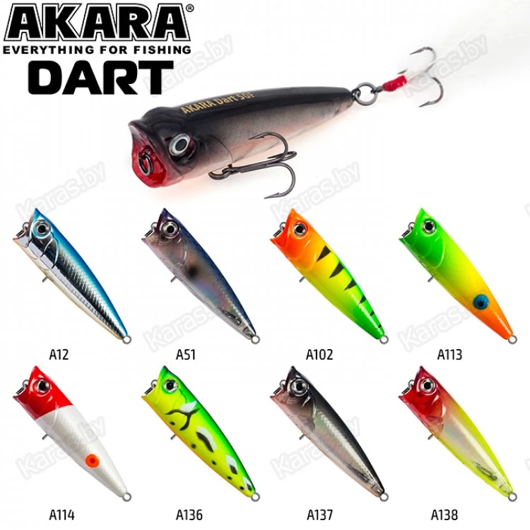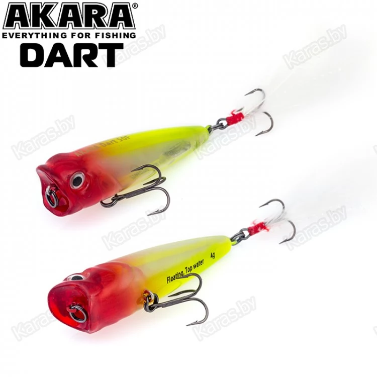 Akara Dart 50F – поппер классической формы длиной 50 мм. Тип плавучести – плавающий (F), вес 4 грамма. Благодаря обтекаемой форме тела имеет отличные полетные характеристики. Предназначен для поверхностной ловли окуня и щуки, а также жереха и голавля. Оснащен крючками из высокоуглеродистой стали. Шумовой.