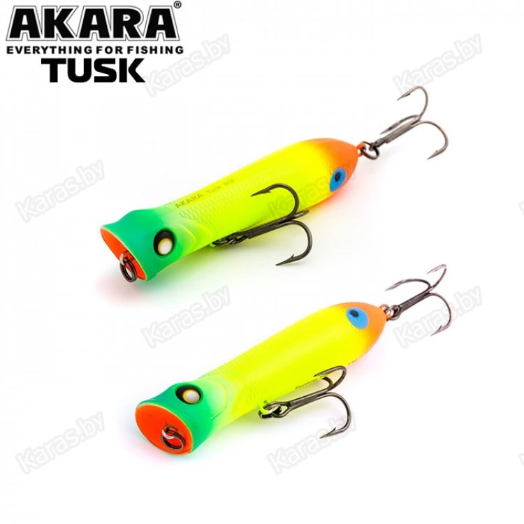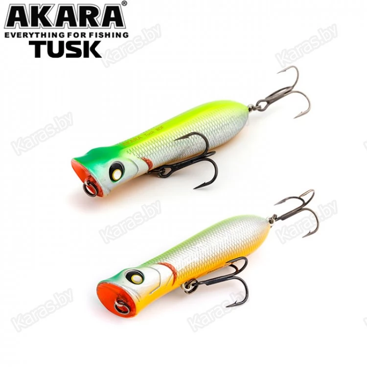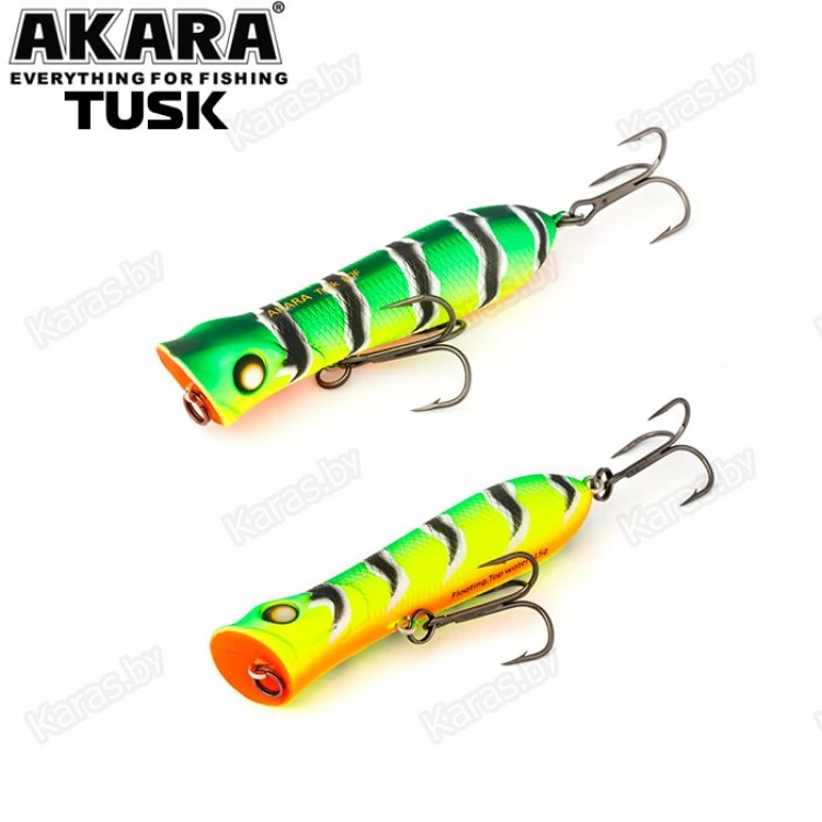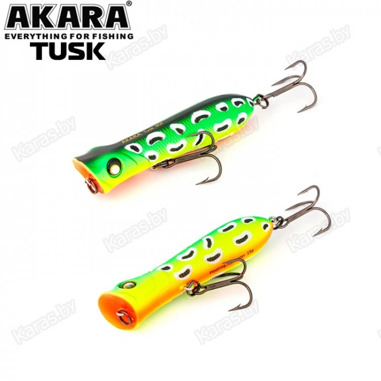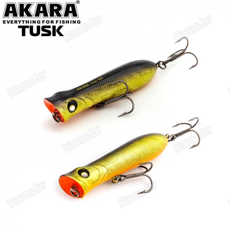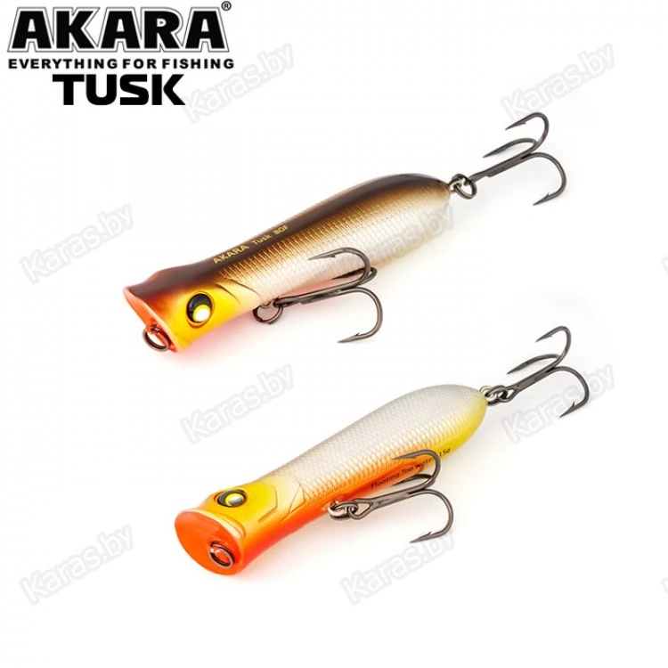 Воблер поппер Akara Tusk 80F - поппер, имеющий аэродинамическую форму, позволяющий выполнять дальние и точные забросы. Благодаря глубокой выемке в передней части приманки создает громкие звуки и при рывковой проводке, и активно разбрызгивает воду перед собой. Также оставляет характерный след на поверхности. В сумме эти факторы являются отличными раздражителями практически для любой хищной рыбы, в первую очередь для щуки и окуня. Наибольшую эффективность поппер проявляет при ловле над зарослями травы. Плавающий, поверхностный.