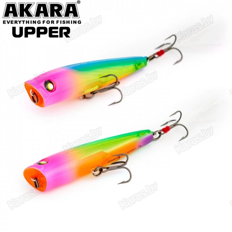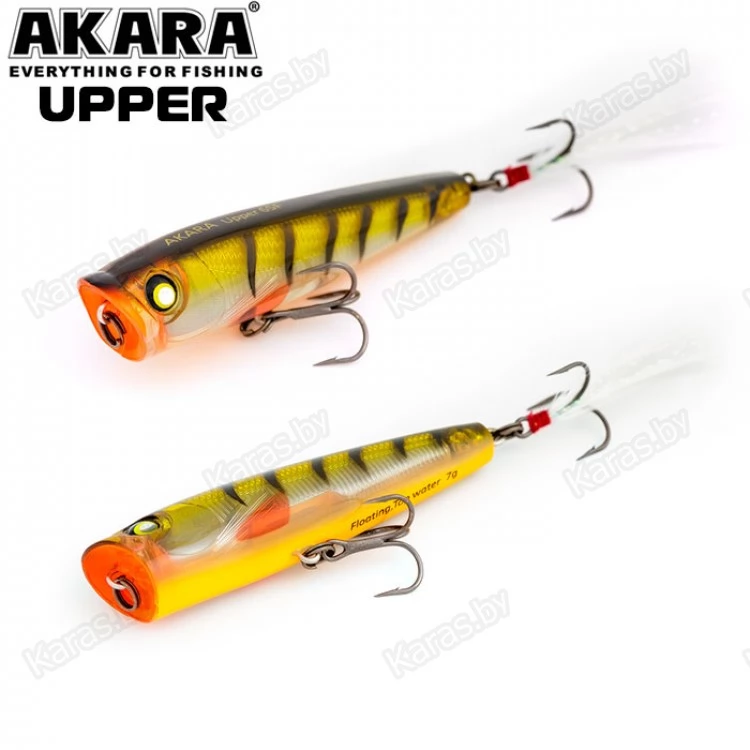 Воблер поппер Akara Upper 65F - поверхностный воблер класса поппер. Имеет вытянутое тело и «оперение» заднего тройника. За счет обтекаемой формы отлично ведет себя на забросе. Классическая выемка в головной части создает громкие звуки и стабильные завихрения в воде. Akara Upper 65F является незаменимой приманкой при облове сложных участков водоема. Основной добычей этого поппера становятся щука и окунь, но не исключена поимка и других видов рыб. Тип плавучести – плавающий (floating), заглубление – поверхностный.