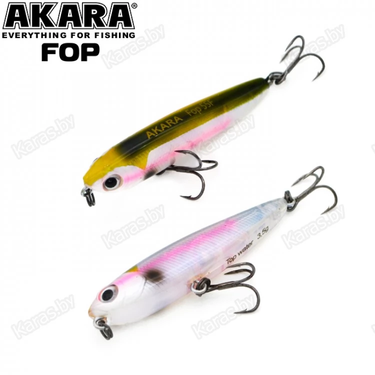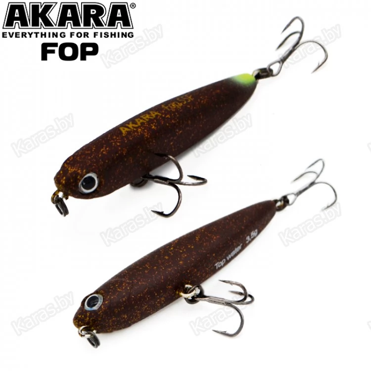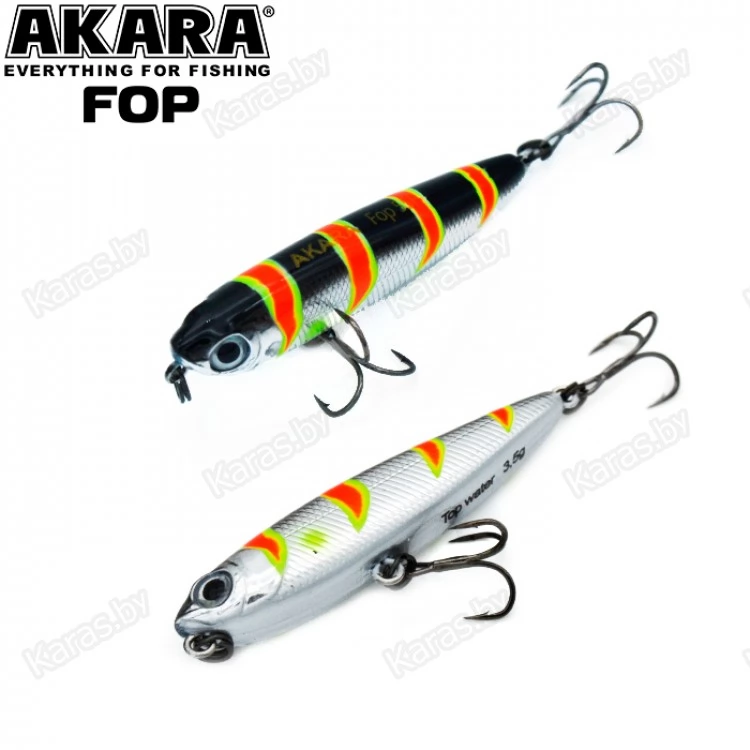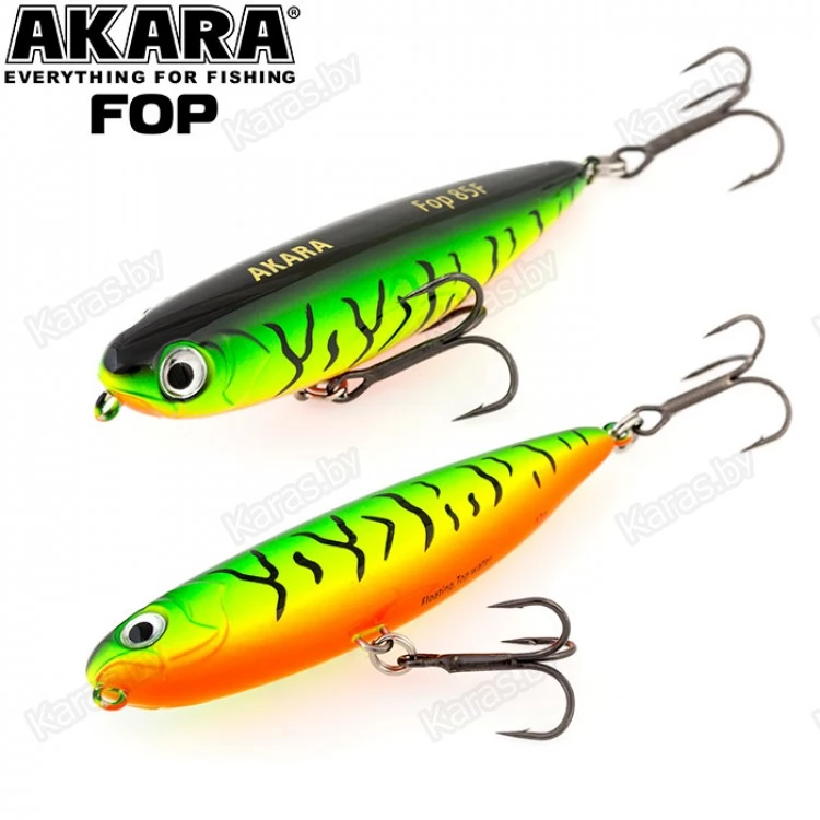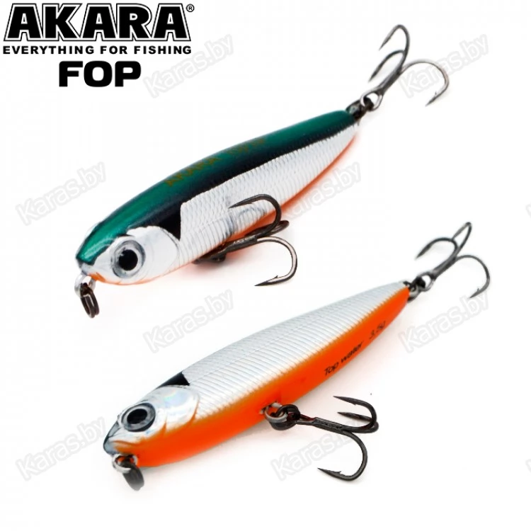 Akara Fop – плавающий волкер. Благодаря компактной торпедообразной форме имеет отличные полетные характеристики. Рекомендуется проводить данный волкер рывковой проводкой. Характерная игра приманки на поверхности воды привлекает рыбу с больших дистанций. Подходит для ловли щуки, окуня, жереха и др. Устойчиво работает на водоемах разных типов. Оснащен крючками из высоколегированной стали. Поверхностный.