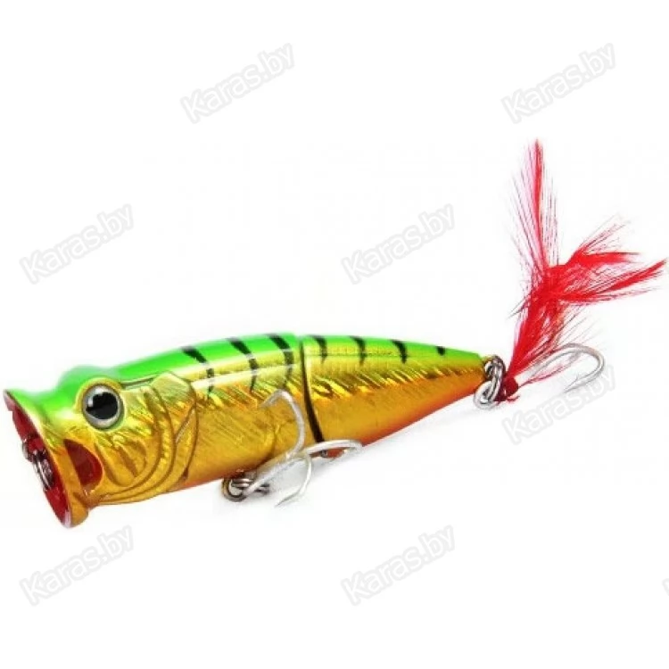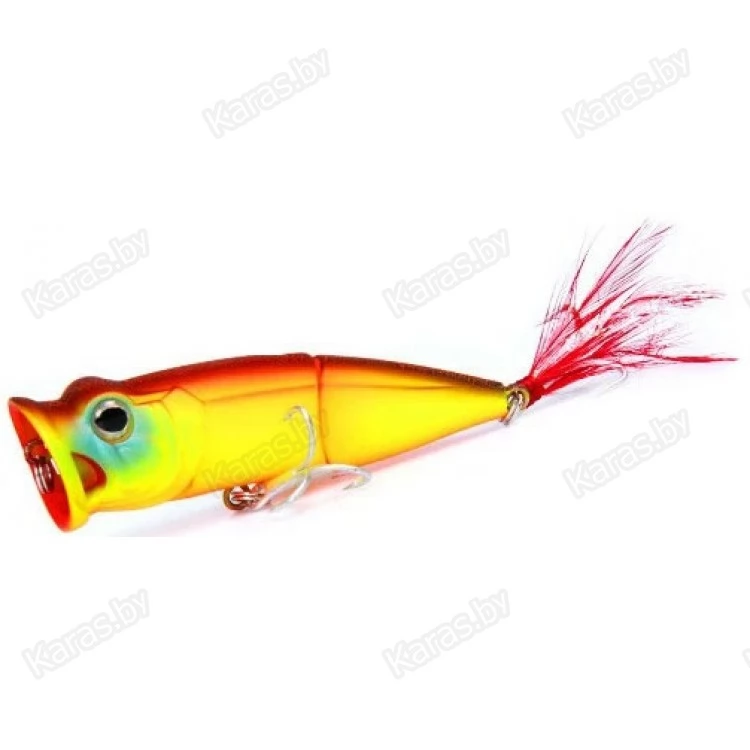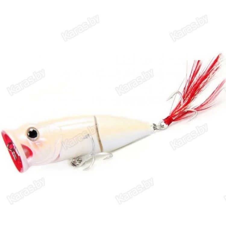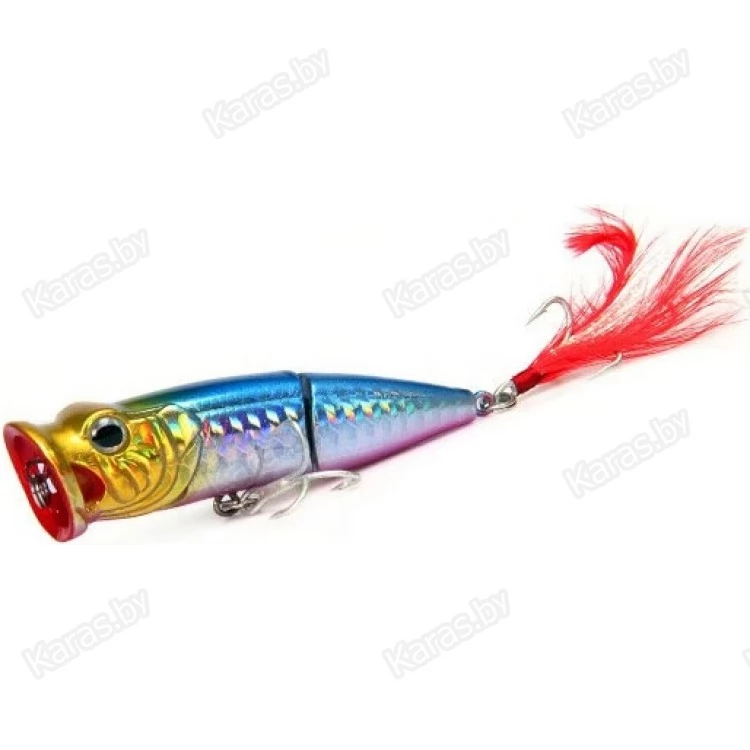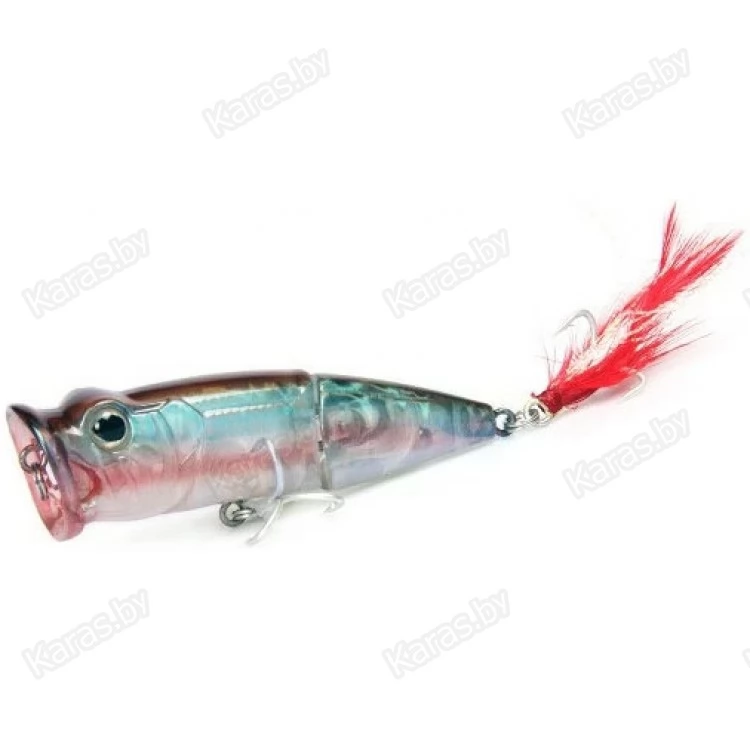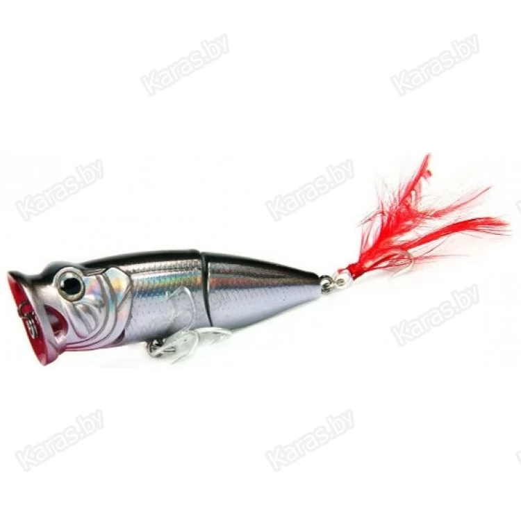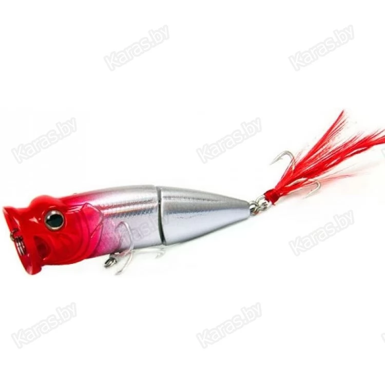 Необычная форма привлекает внимание не только спиннингистов, но и различную хищную рыбу. Bearking Tank 70F это составной поппер на шарнирном металлическом соединении с губами особой формы. Именно благодаря большой округлой выемке с двумя отверстиями по бокам поппер издает громкие булькающие звуки с разбрызгиванием воды по сторонам. Особенность строения корпуса, а именно задняя подвижная часть добавляет остаточных колебаний, что дополнительно провоцирует хищника на атаку на паузе проводки. Задний тройник имеет вызывающее красное оперение (опушку), что создает впечатление раненой рыбки. Реалистичности добавляют выраженные глаза с бровными дугами.